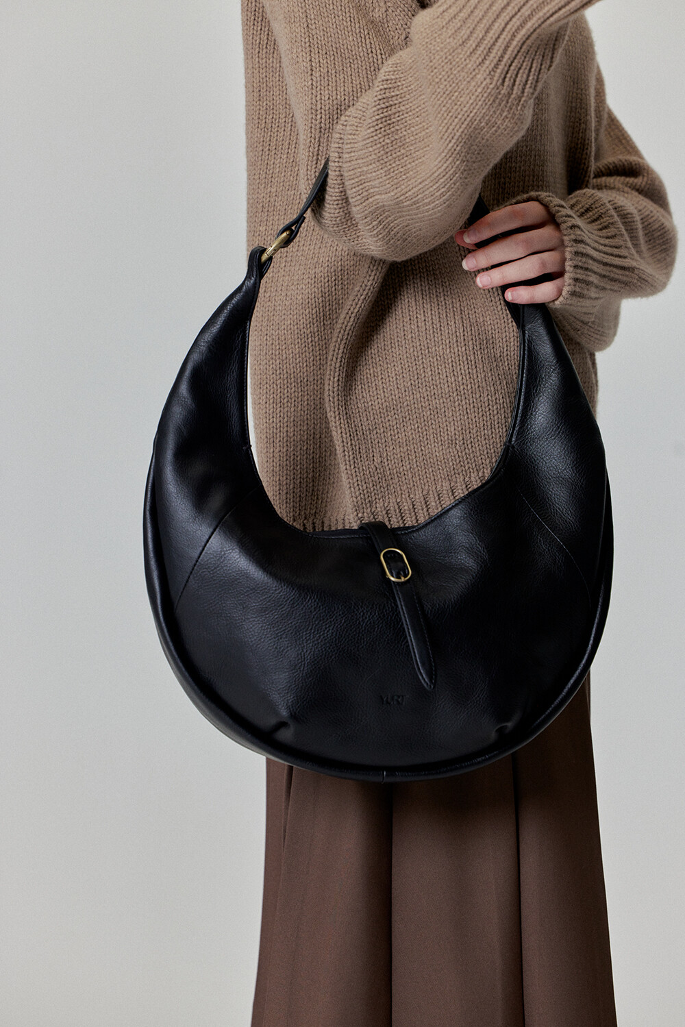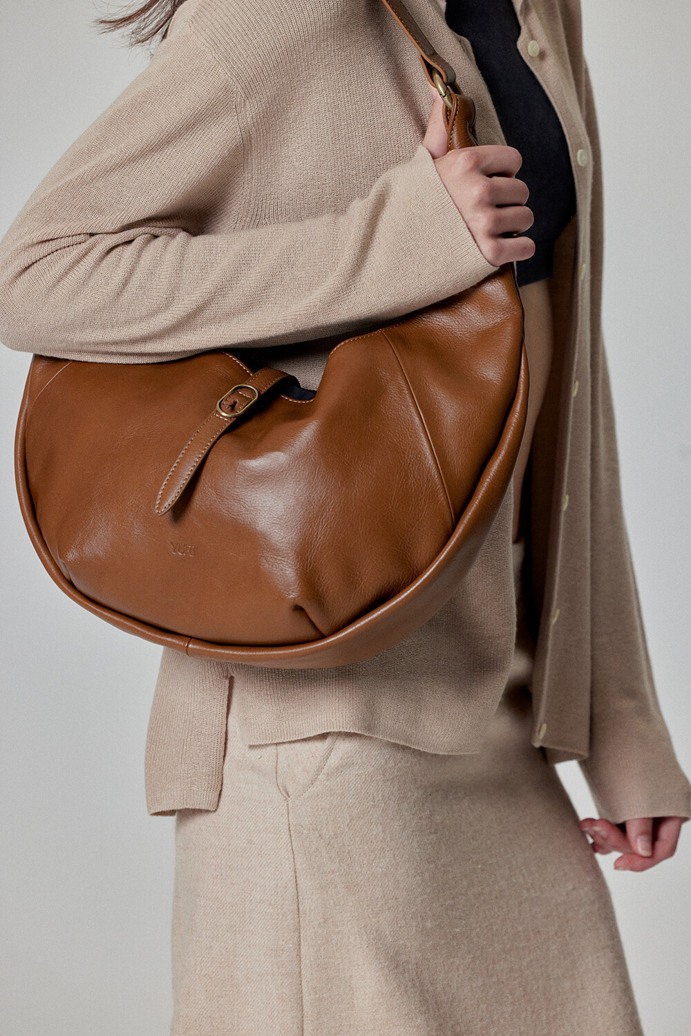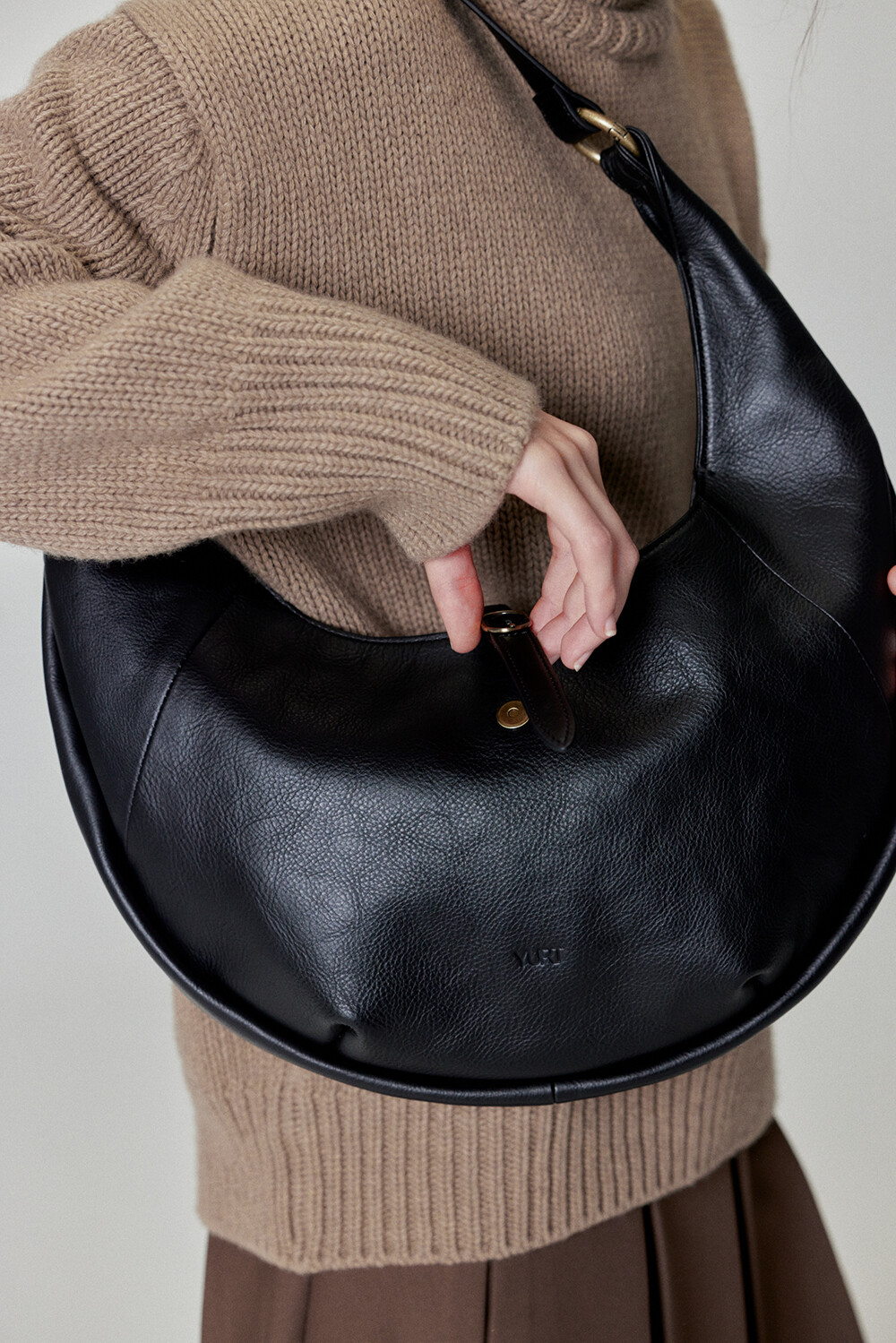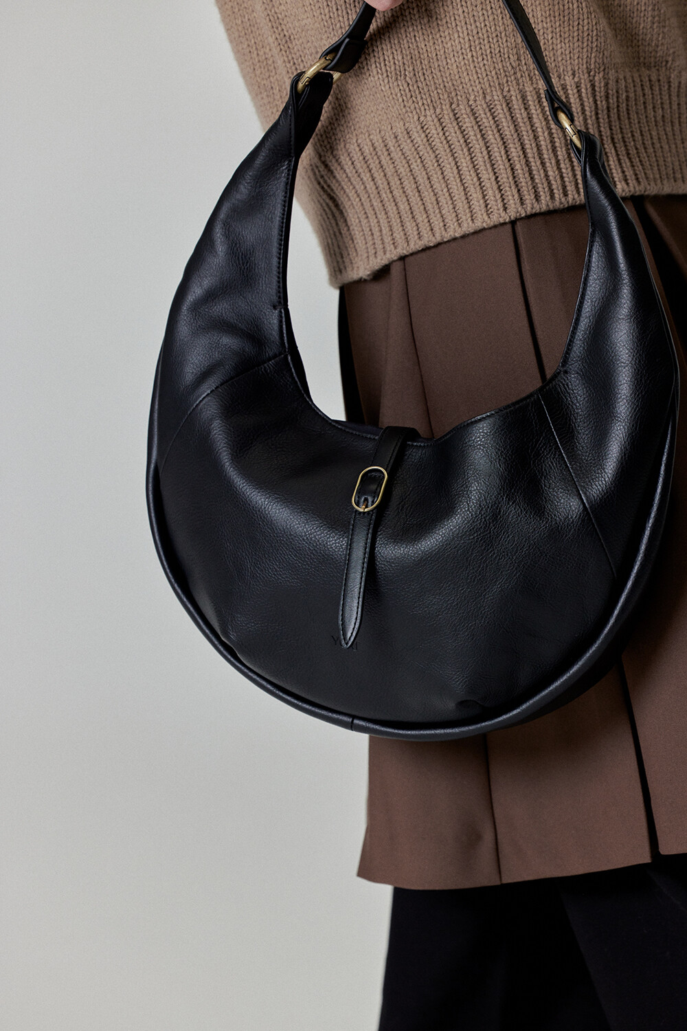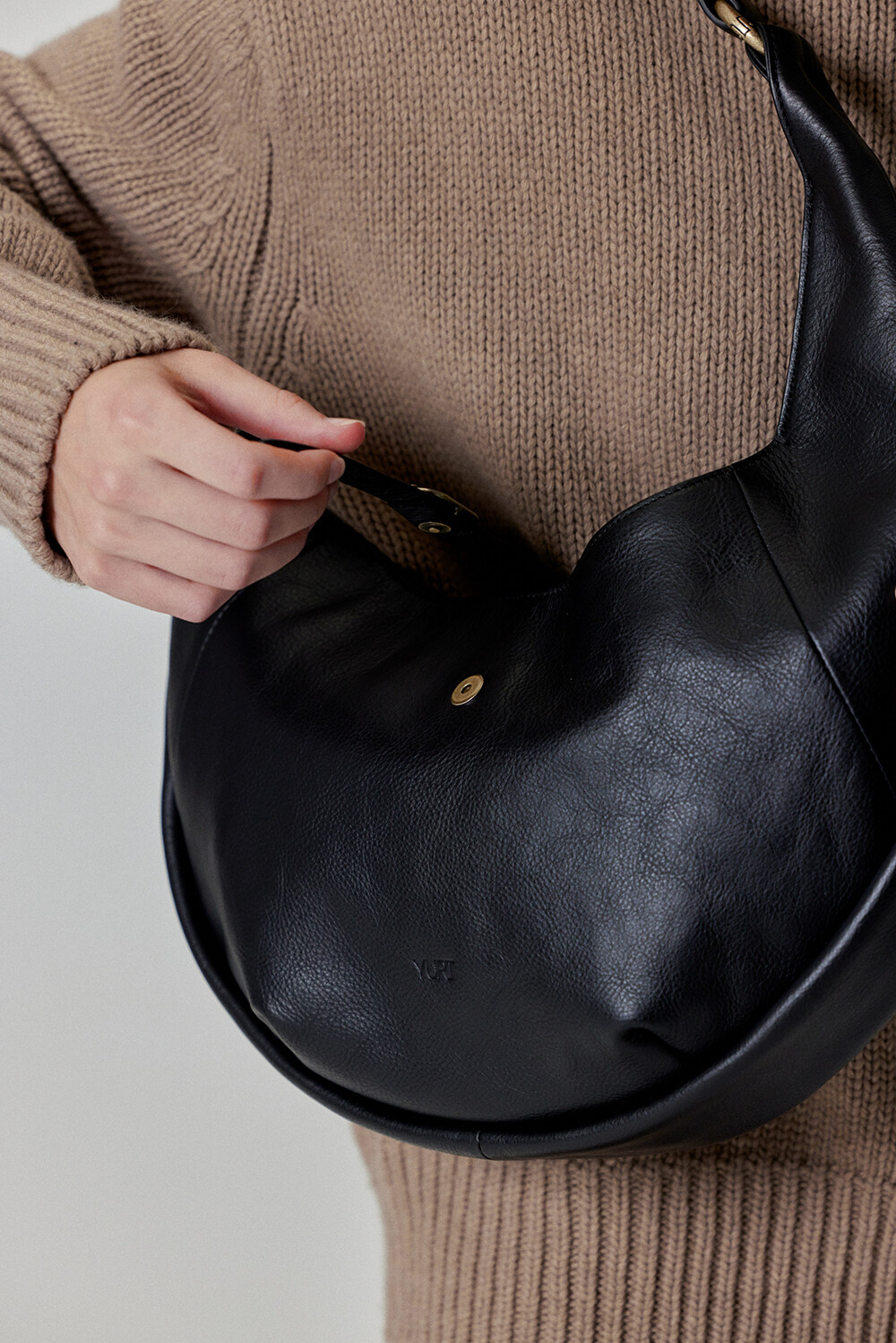 - 부드러운 소가죽에 다트를 잡아 형성한 반달형 실루엣과 볼드한 장식이 어우러진 호보백입니다.