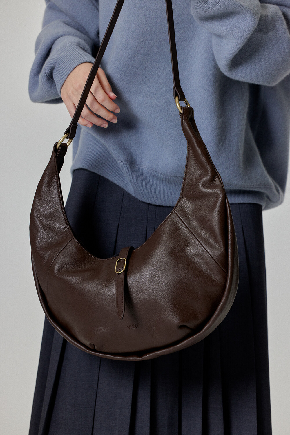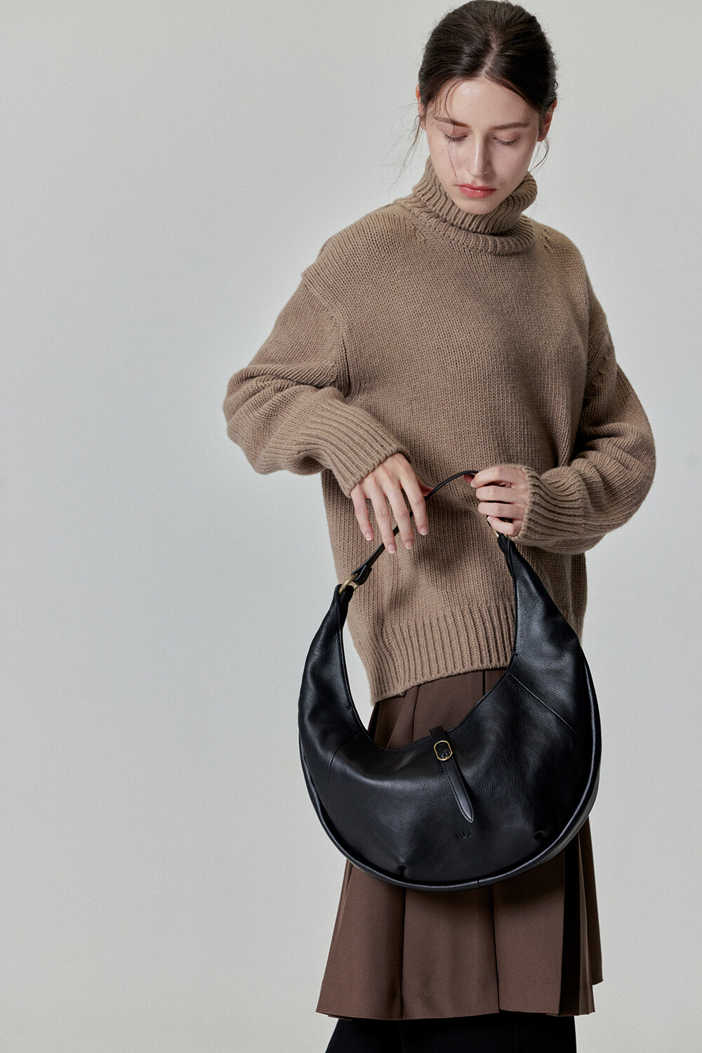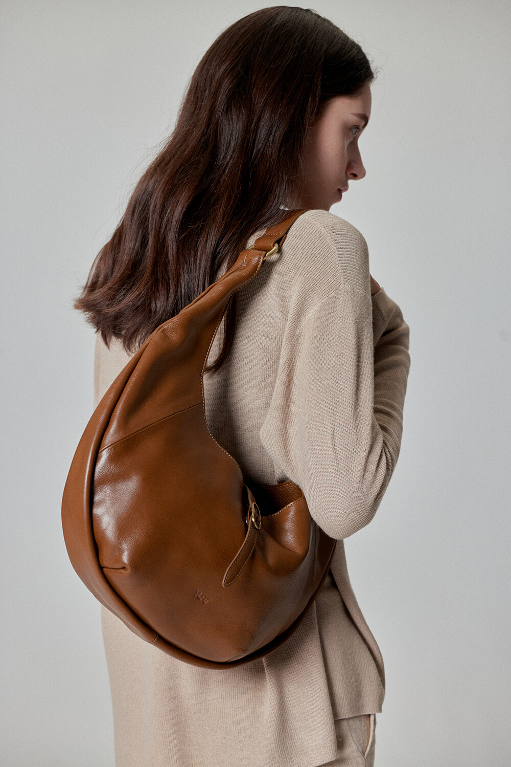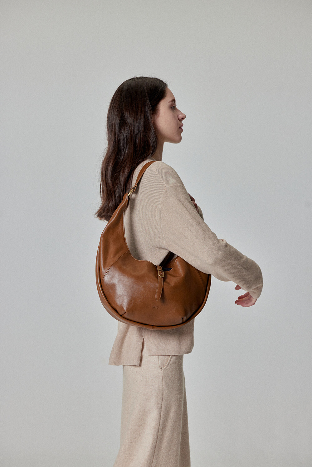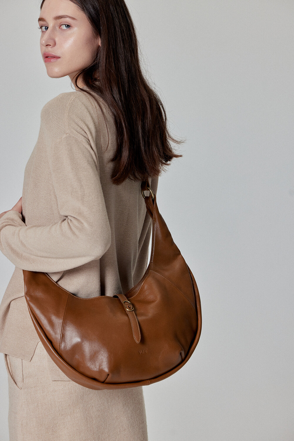 - 부드러운 소가죽에 다트를 잡아 형성한 반달형 실루엣과 볼드한 장식이 어우러진 호보백입니다.