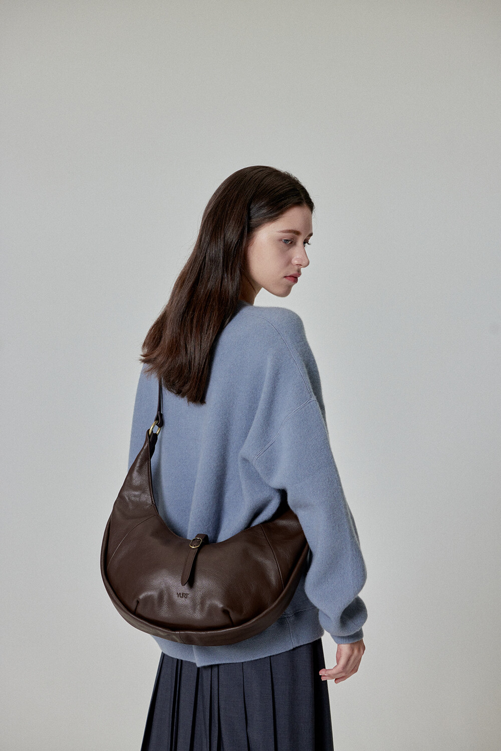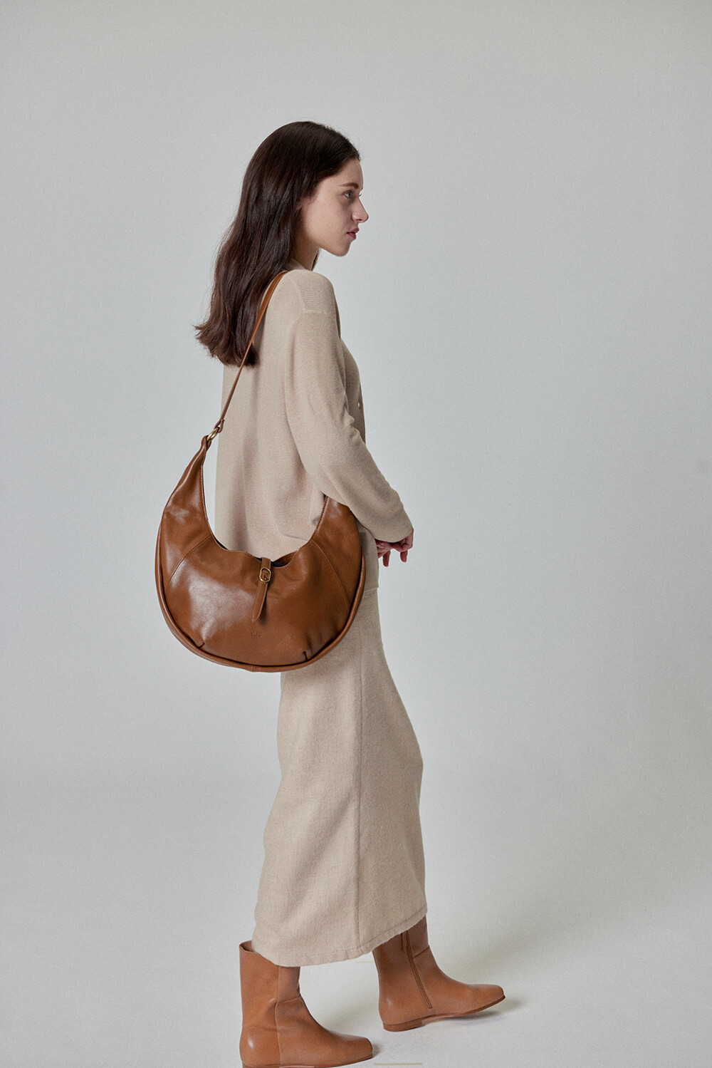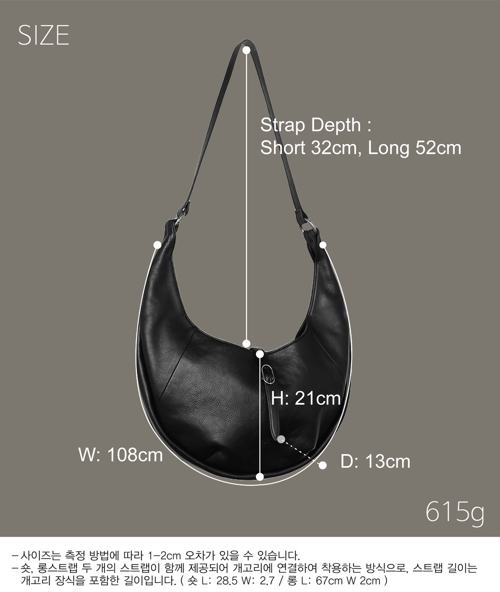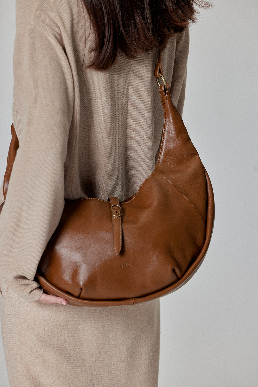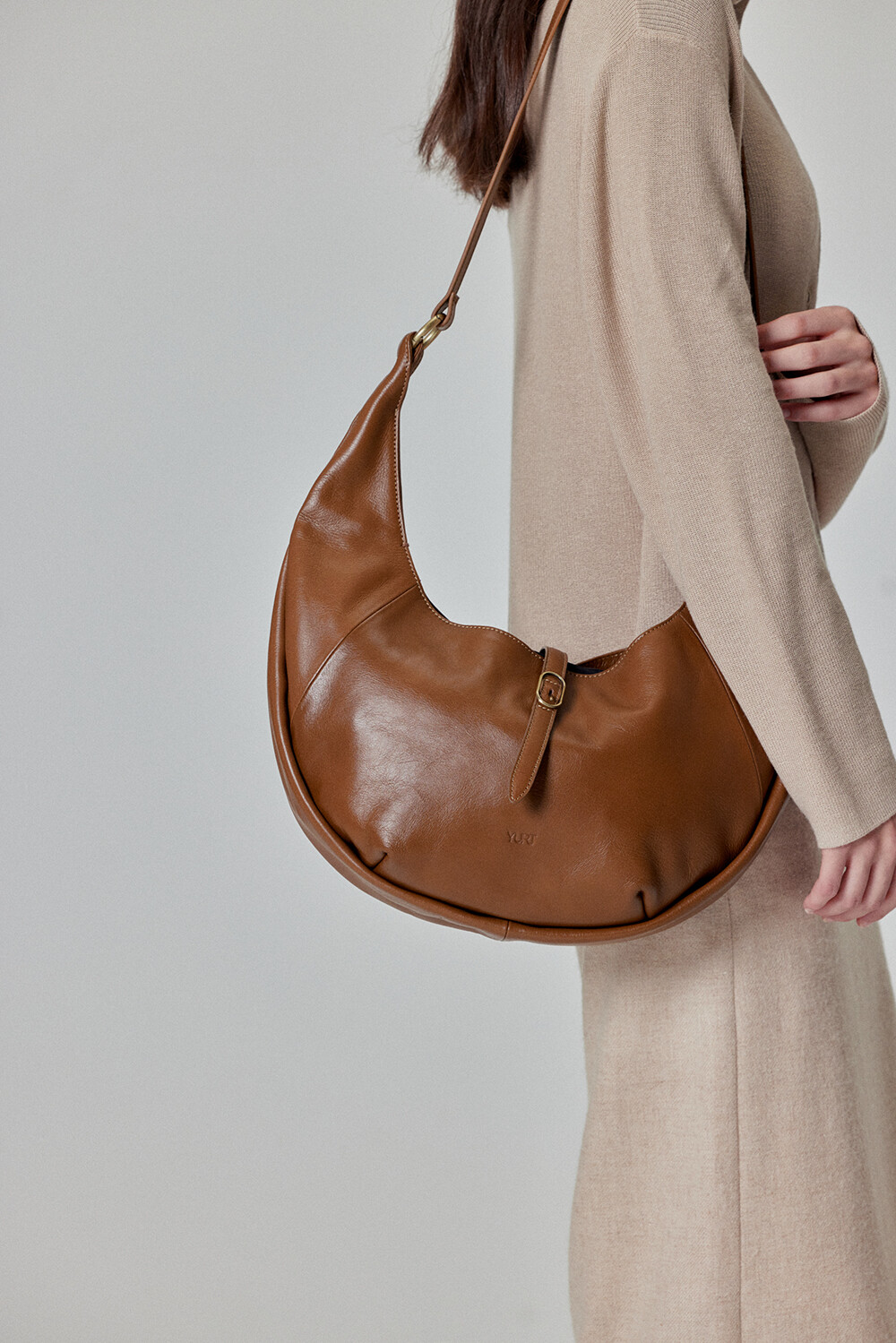 - 부드러운 소가죽에 다트를 잡아 형성한 반달형 실루엣과 볼드한 장식이 어우러진 호보백입니다.