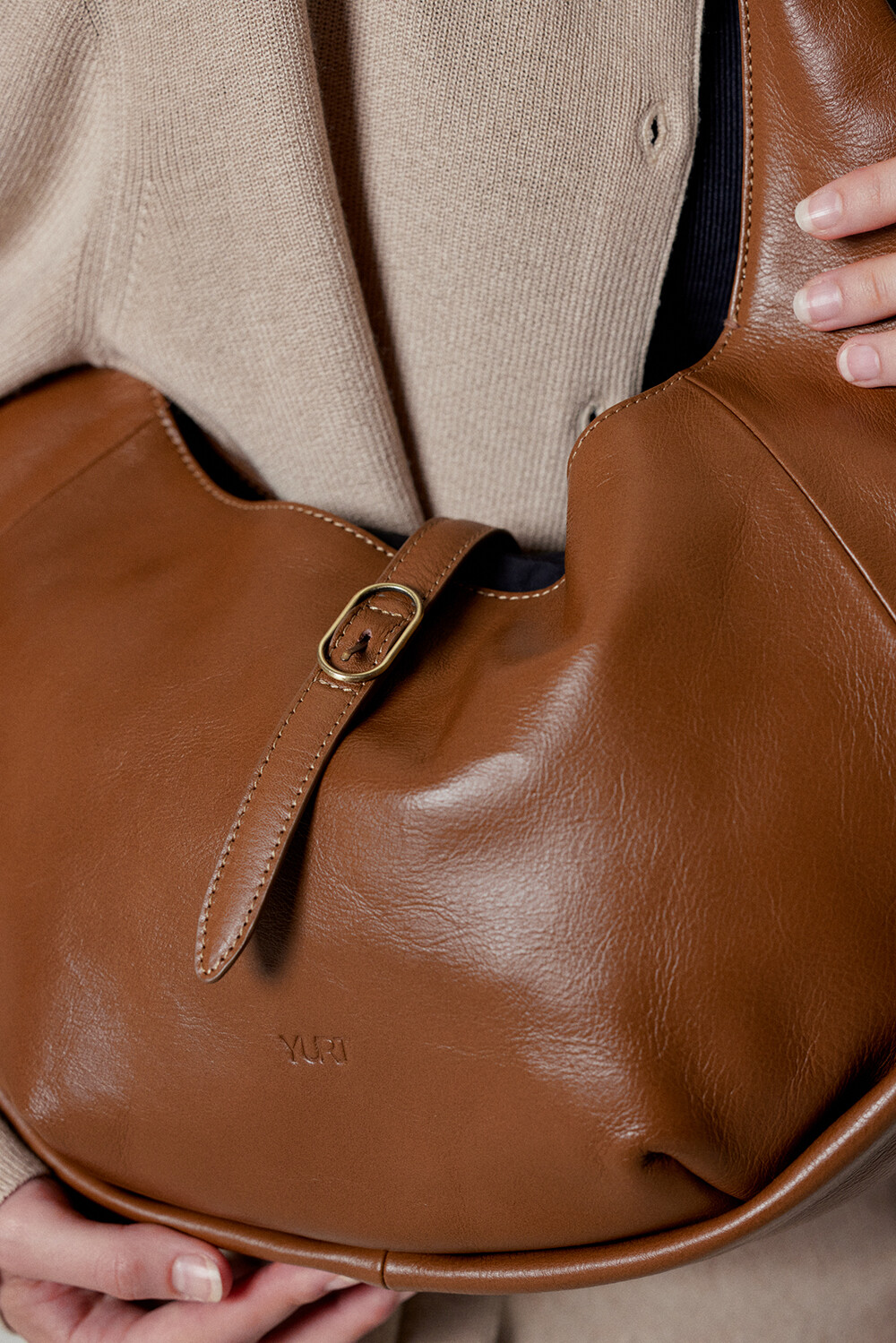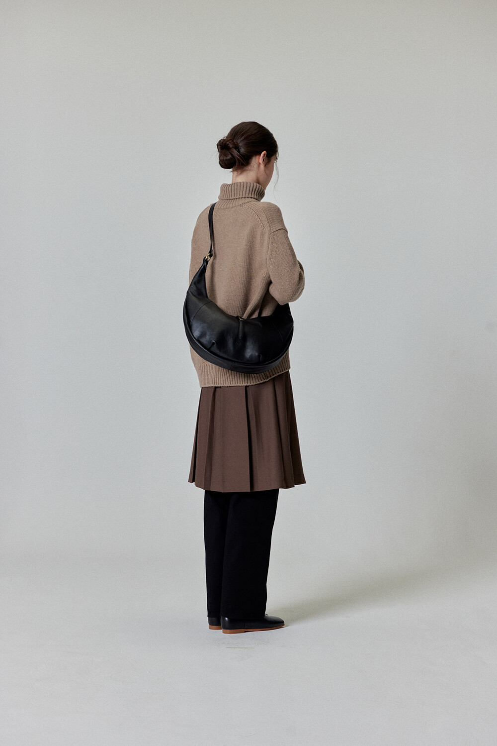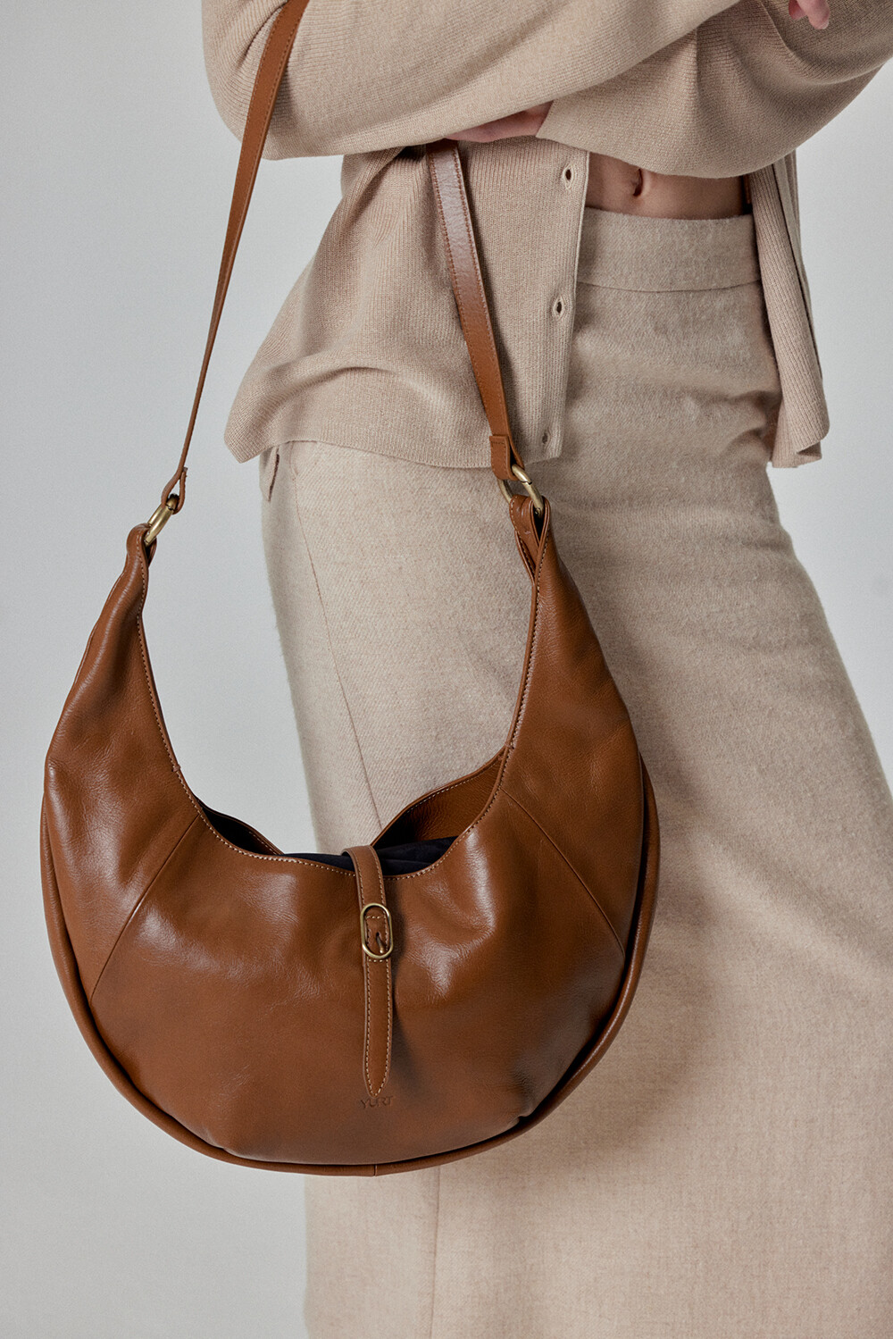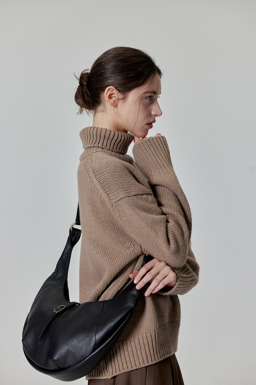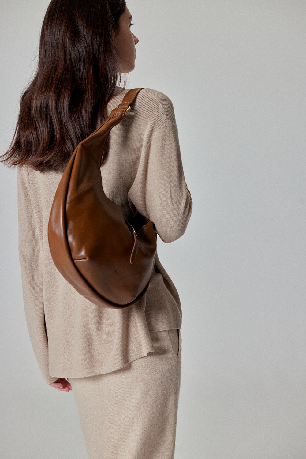 - 부드러운 소가죽에 다트를 잡아 형성한 반달형 실루엣과 볼드한 장식이 어우러진 호보백입니다.