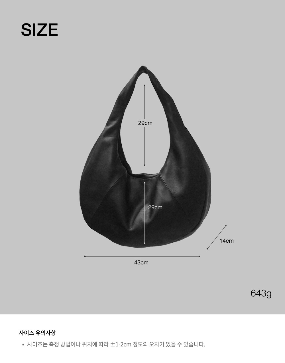 해당 상품은 가방의 형태를 잡아주는 심지 또는 부자재를 사용하지 않고 가죽으로만 형태를 잡아 완성한 상품입니다. 이에 배송 과정에서 발생되는 눌림 현상으로 인한 사이즈 오차가 발생될 수 있으며 특히 Strap Depth의 경우 곡선형의 손잡이 특성상 측정 방법에 따라 사이즈가 다르게 측정될 수 있는 점 안내드립니다. 스트랩을 잡고 가볍게 펴주신 후 둥그런 형태를 잡아 사용 부탁드립니다.