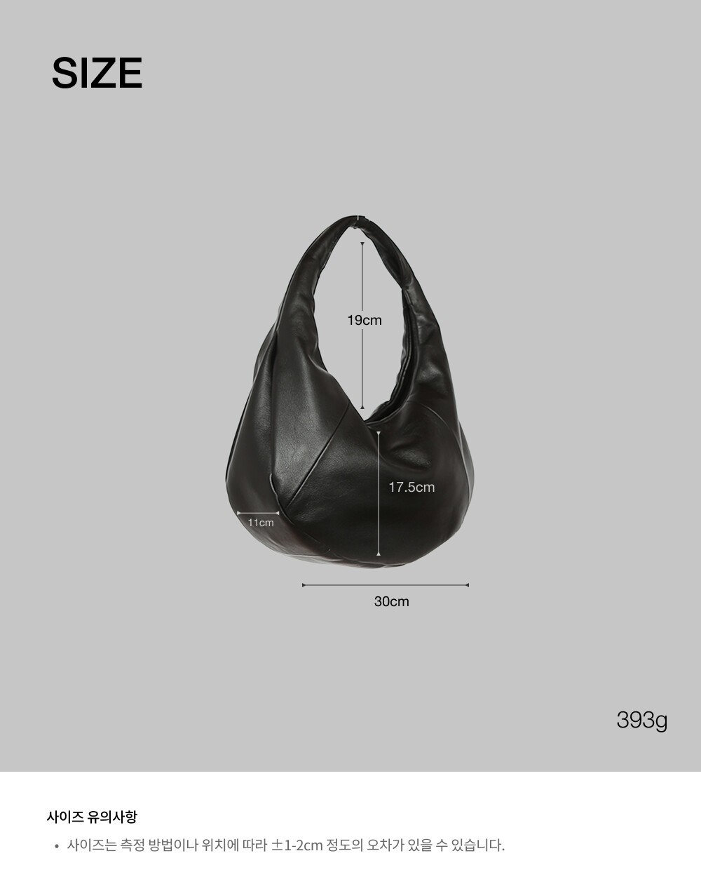 해당 상품은 가방의 형태를 잡아주는 심지 또는 부자재를 사용하지 않고 가죽으로만 형태를 잡아 완성한 상품입니다. 이에 배송 과정에서 발생되는 눌림 현상으로 인한 사이즈 오차가 발생될 수 있으며 특히 Strap Depth의 경우 곡선형의 손잡이 특성상 측정 방법에 따라 사이즈가 다르게 측정될 수 있는 점 안내드립니다. 스트랩을 잡고 가볍게 펴주신 후 둥그런 형태를 잡아 사용 부탁드립니다.
