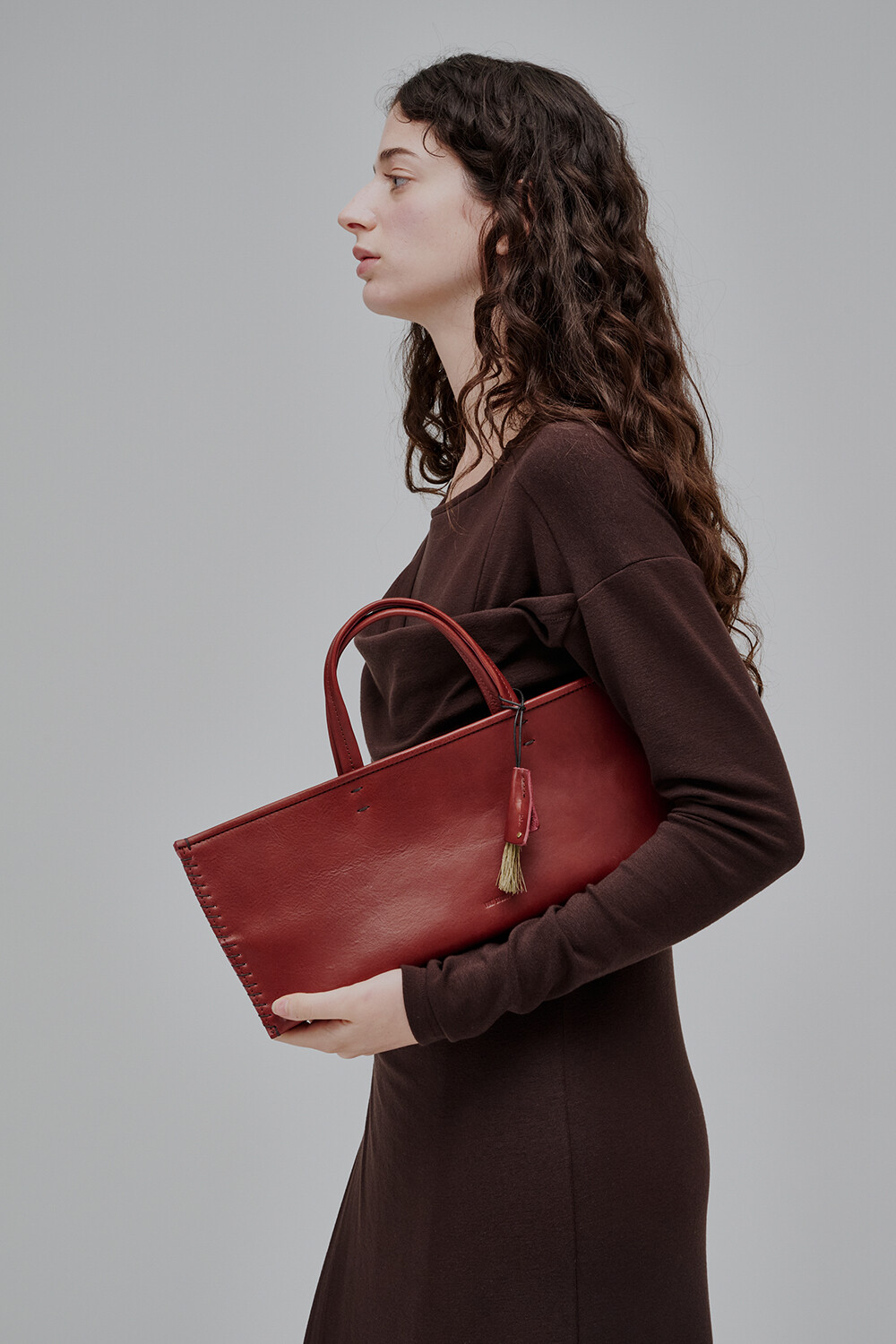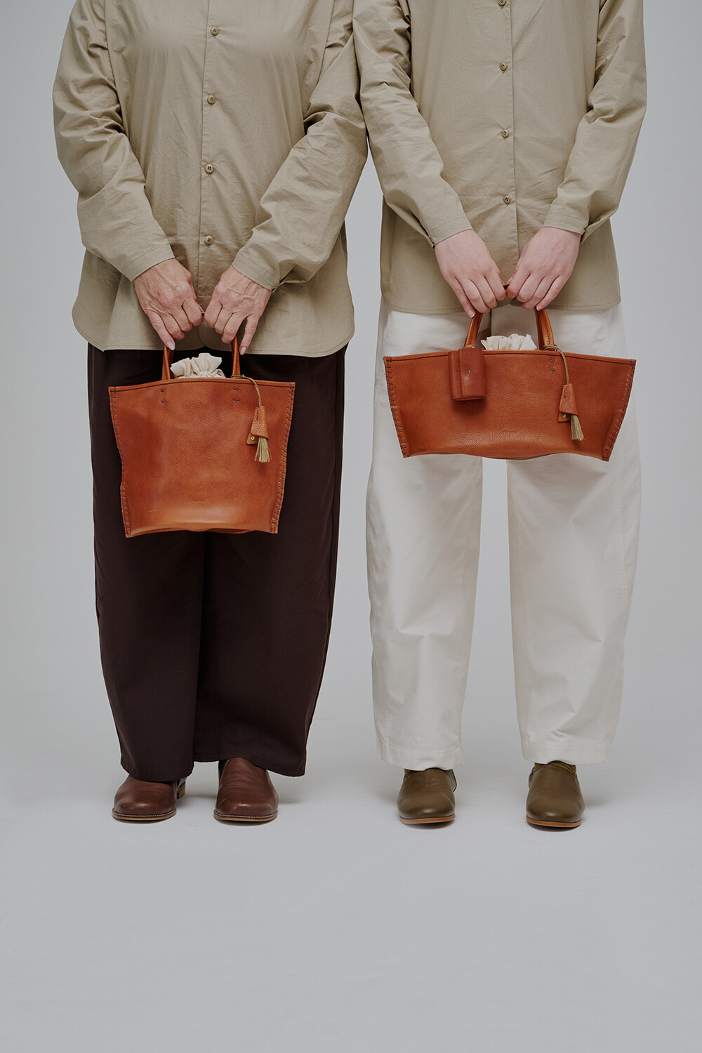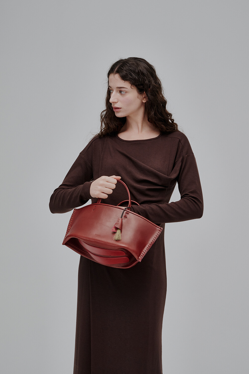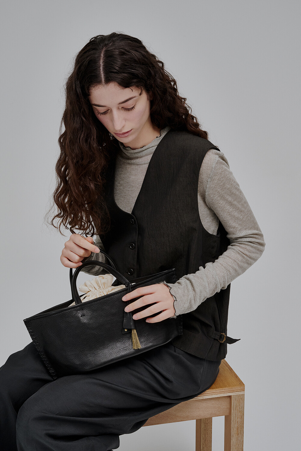 이탈리아산 천연 베지터블 가죽이 가지고 있는 본연의 멋을 고스란히 살려 깔끔하고 담백한 느낌을 주는 가방입니다. 손잡이에는 싸리로 제작한 솔 참을 달아 유르트만의 감도를 더해주었습니다. 바닥면에는 통가죽을 덧대어 사용 시 밑면이 무너지지 않도록 단단히 잡아줄 뿐 아니라, 안으로 접혀 플랫한 상태로 보관이 용이하도록 감각적인 실용성을 더했습니다. 물건을 넣었을 땐 보트 형태로 바닥이 넓게 펼쳐지며 넉넉한 수납이 가능합니다. 안감이 없이도 부담 없이 사용하실 수 있도록 패브릭 이너 파우치를 함께 구성했으며, 멀버리, 카멜, 블랙의 3가지 색상으로 만나보실 수 있습니다.