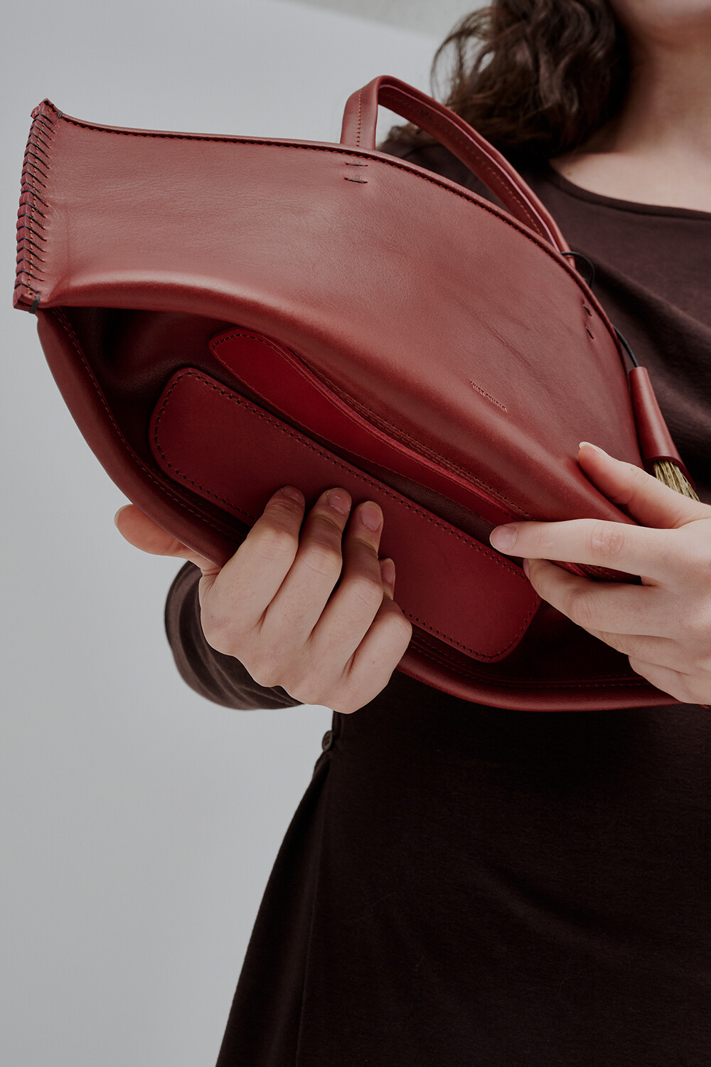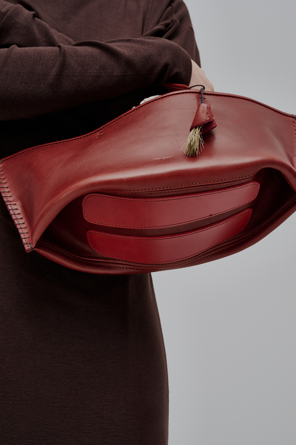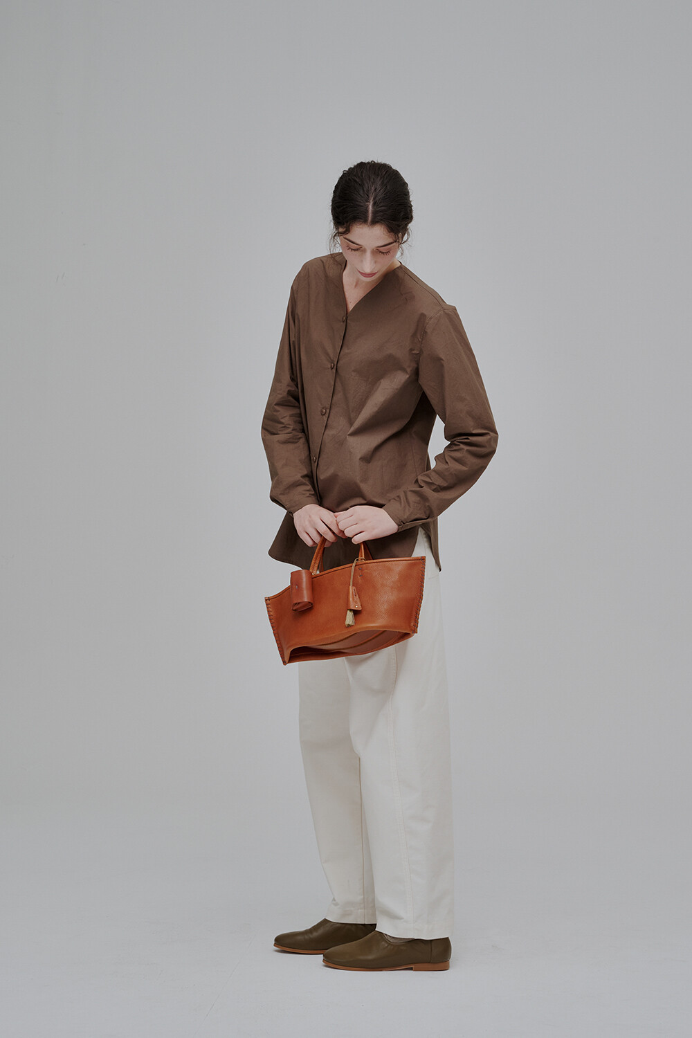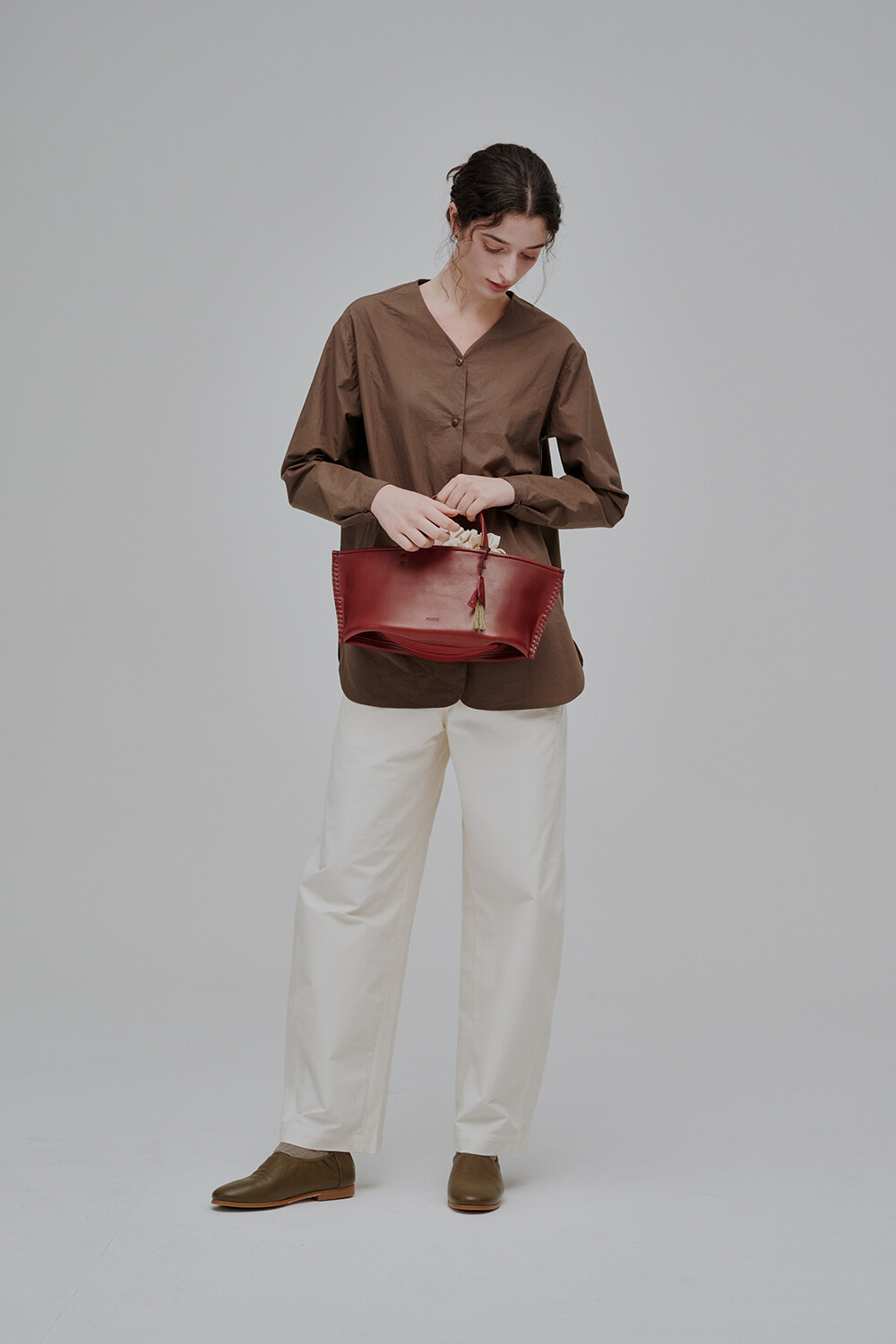 이탈리아산 천연 베지터블 가죽이 가지고 있는 본연의 멋을 고스란히 살려 깔끔하고 담백한 느낌을 주는 가방입니다. 손잡이에는 싸리로 제작한 솔 참을 달아 유르트만의 감도를 더해주었습니다. 바닥면에는 통가죽을 덧대어 사용 시 밑면이 무너지지 않도록 단단히 잡아줄 뿐 아니라, 안으로 접혀 플랫한 상태로 보관이 용이하도록 감각적인 실용성을 더했습니다. 물건을 넣었을 땐 보트 형태로 바닥이 넓게 펼쳐지며 넉넉한 수납이 가능합니다. 안감이 없이도 부담 없이 사용하실 수 있도록 패브릭 이너 파우치를 함께 구성했으며, 멀버리, 카멜, 블랙의 3가지 색상으로 만나보실 수 있습니다.