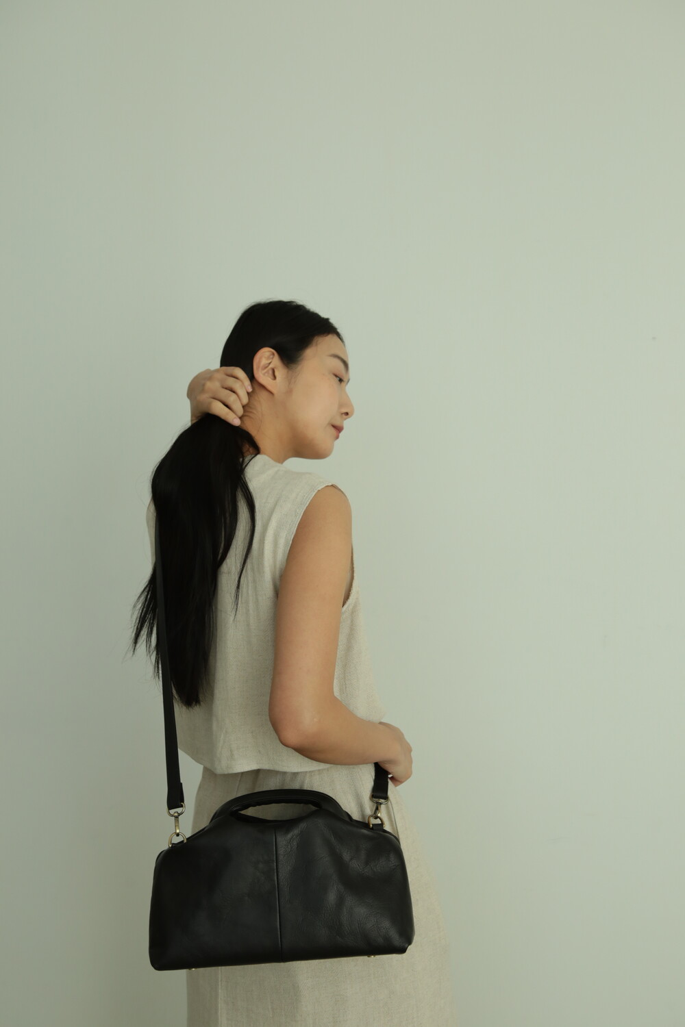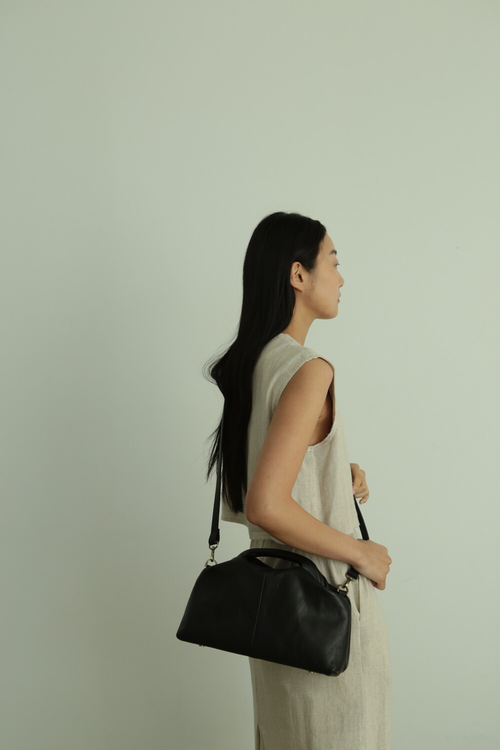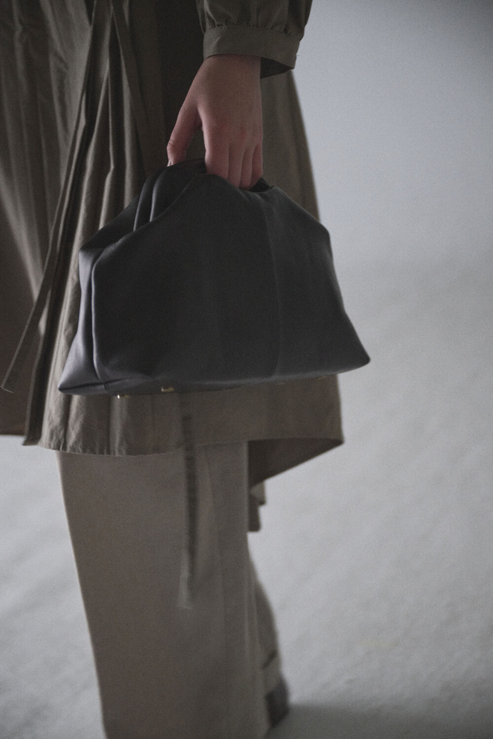 또한 프레임 연결 부분이 가죽과 맞닿아 있어, 손잡이를 오므릴 경우 초기에는 경첩에 맞물린 가죽 두께로 인해 손잡이가 살짝 벌어져 보일 수 있습니다. 이는 사용하면서 가죽이 자연스럽게 길들여지며 점차 안정적으로 여며지게 됩니다. COLOR Black, Choco, Ivory MATERIAL Cow Leather