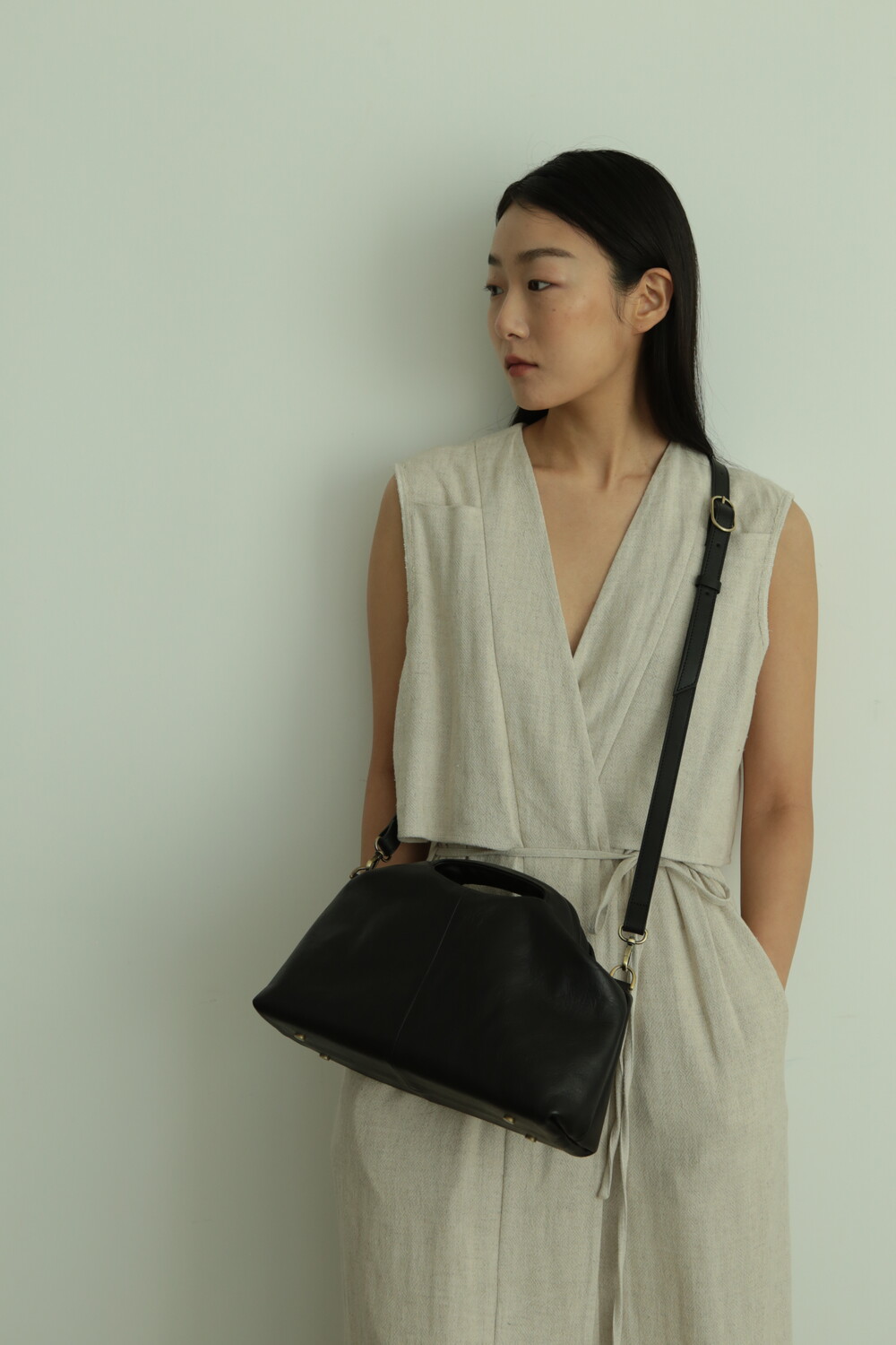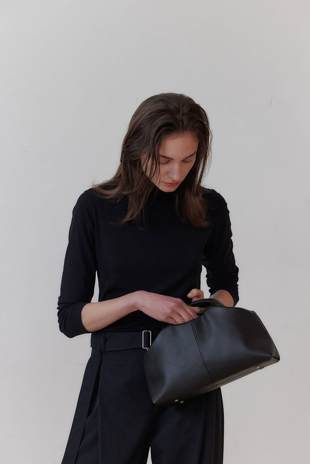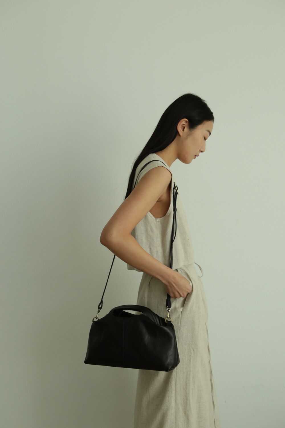 또한 프레임 연결 부분이 가죽과 맞닿아 있어, 손잡이를 오므릴 경우 초기에는 경첩에 맞물린 가죽 두께로 인해 손잡이가 살짝 벌어져 보일 수 있습니다. 이는 사용하면서 가죽이 자연스럽게 길들여지며 점차 안정적으로 여며지게 됩니다. COLOR Black, Choco, Ivory MATERIAL Cow Leather