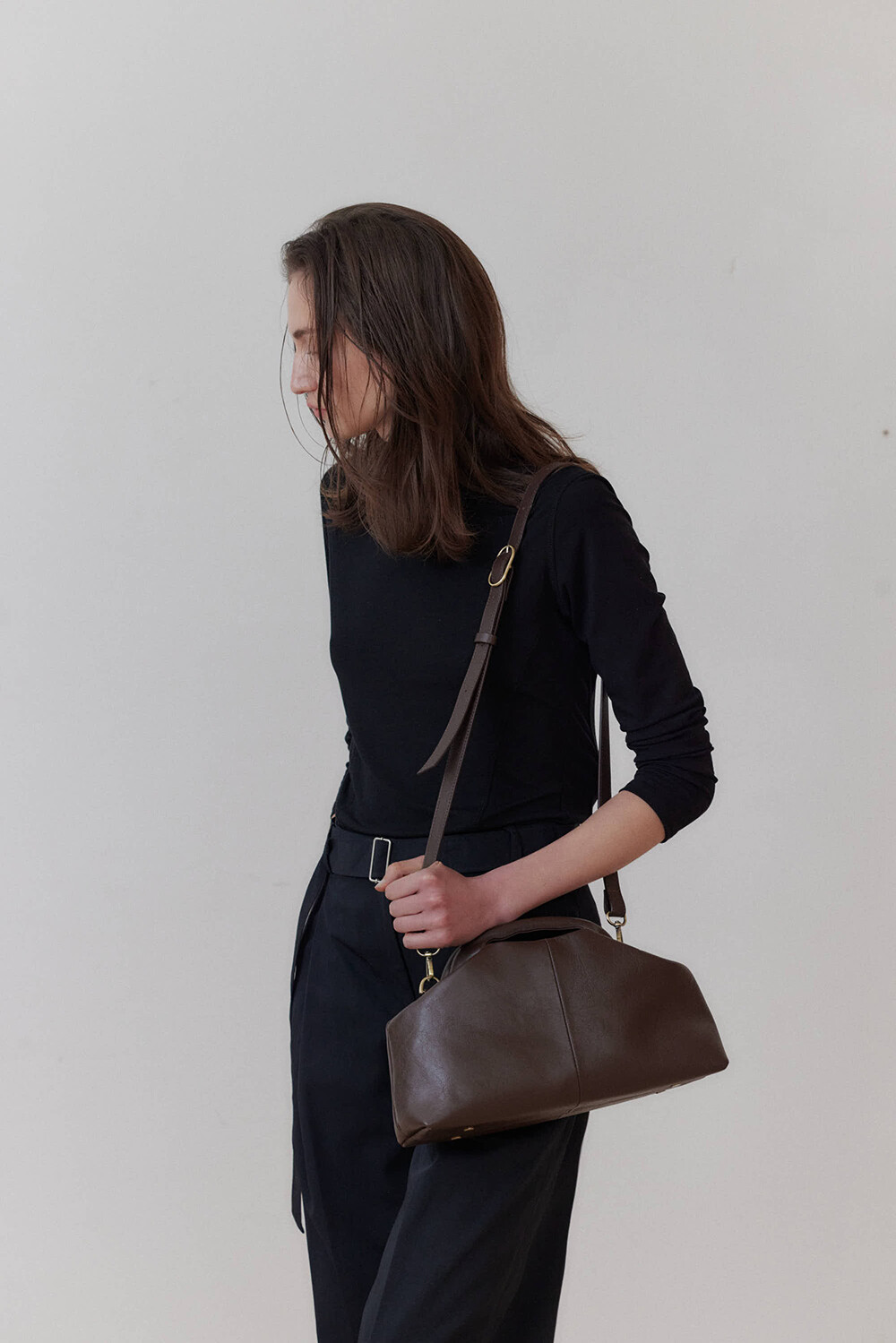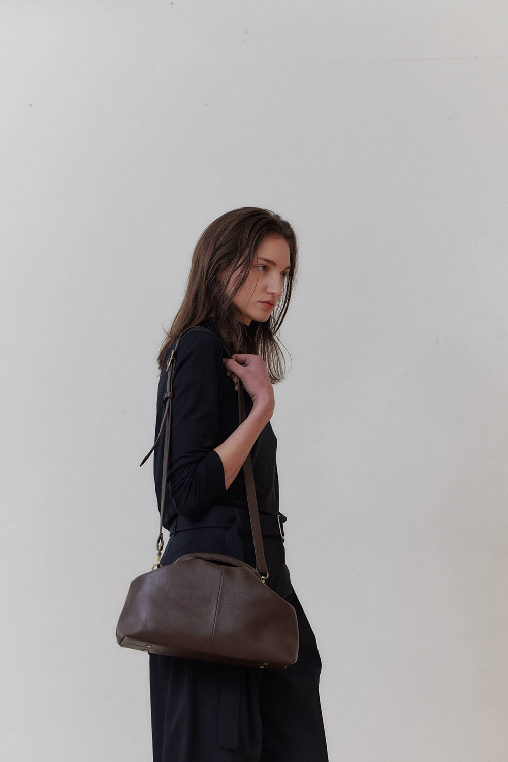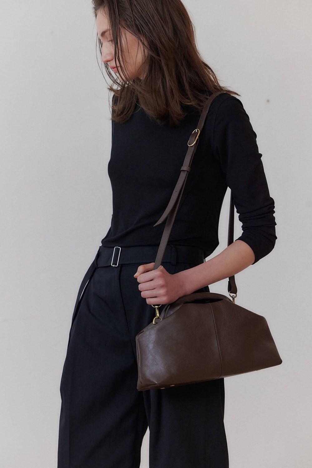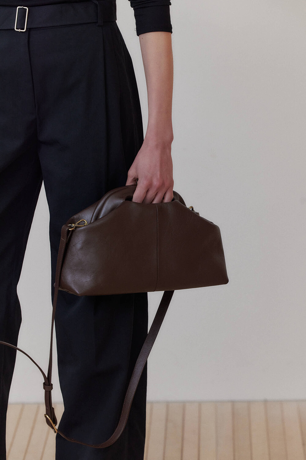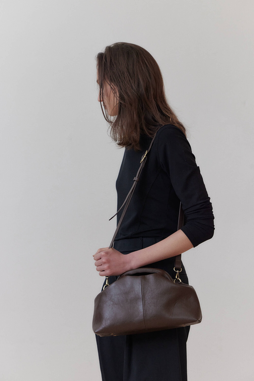 또한 프레임 연결 부분이 가죽과 맞닿아 있어, 손잡이를 오므릴 경우 초기에는 경첩에 맞물린 가죽 두께로 인해 손잡이가 살짝 벌어져 보일 수 있습니다. 이는 사용하면서 가죽이 자연스럽게 길들여지며 점차 안정적으로 여며지게 됩니다. COLOR Black, Choco, Ivory MATERIAL Cow Leather