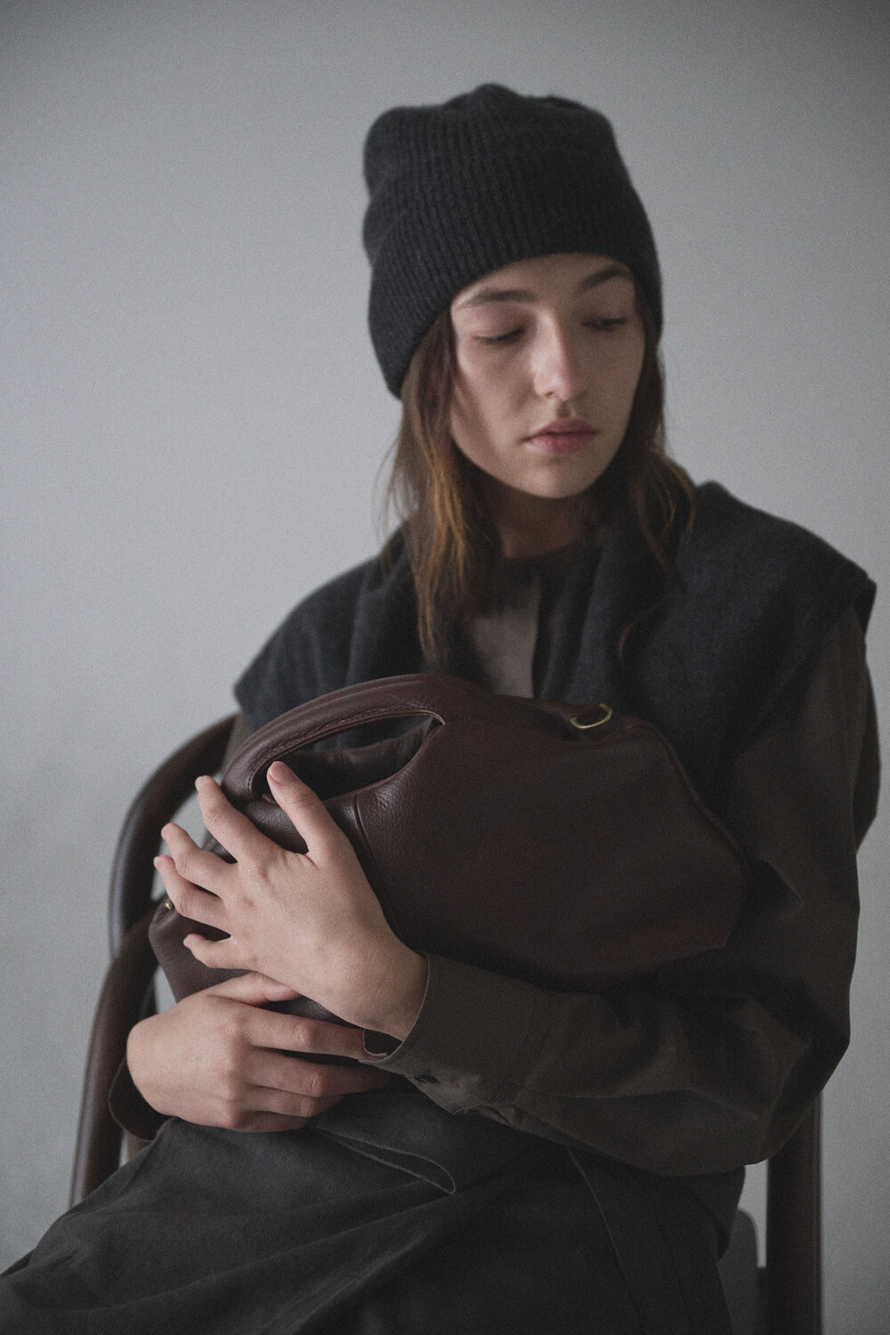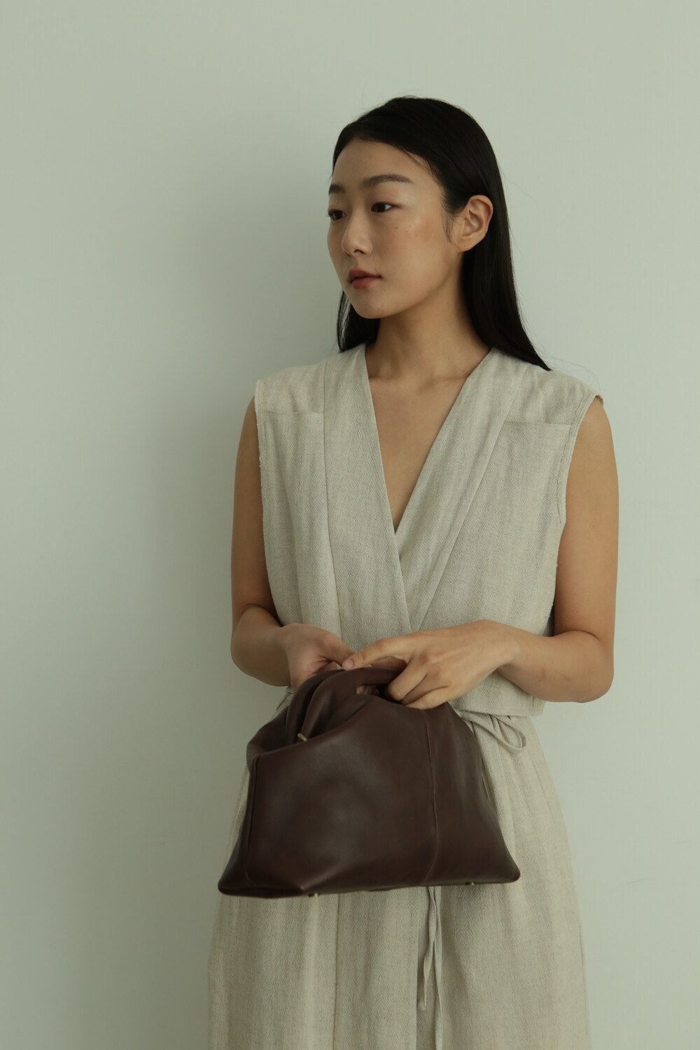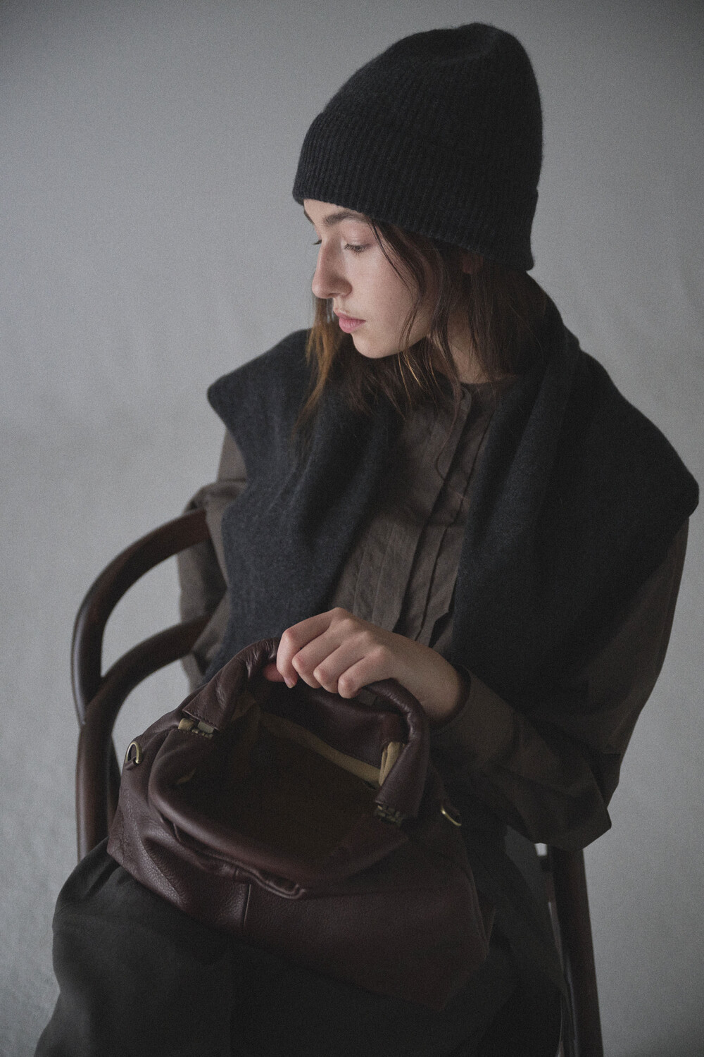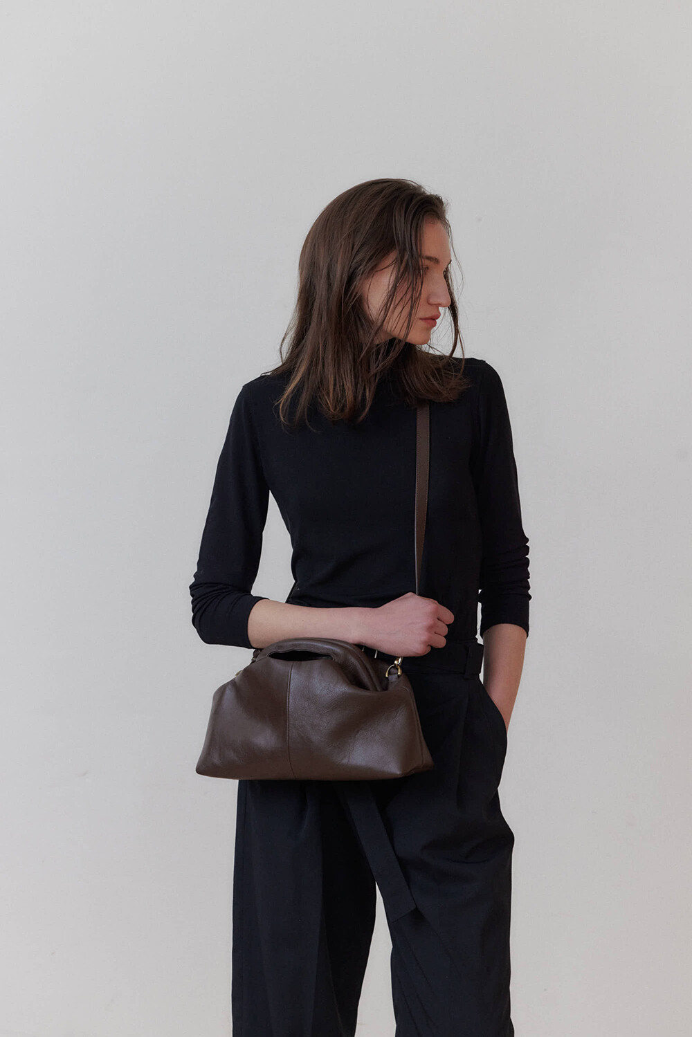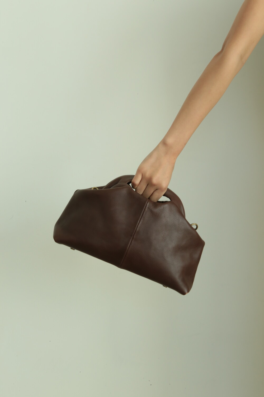 또한 프레임 연결 부분이 가죽과 맞닿아 있어, 손잡이를 오므릴 경우 초기에는 경첩에 맞물린 가죽 두께로 인해 손잡이가 살짝 벌어져 보일 수 있습니다. 이는 사용하면서 가죽이 자연스럽게 길들여지며 점차 안정적으로 여며지게 됩니다. COLOR Black, Choco, Ivory MATERIAL Cow Leather
