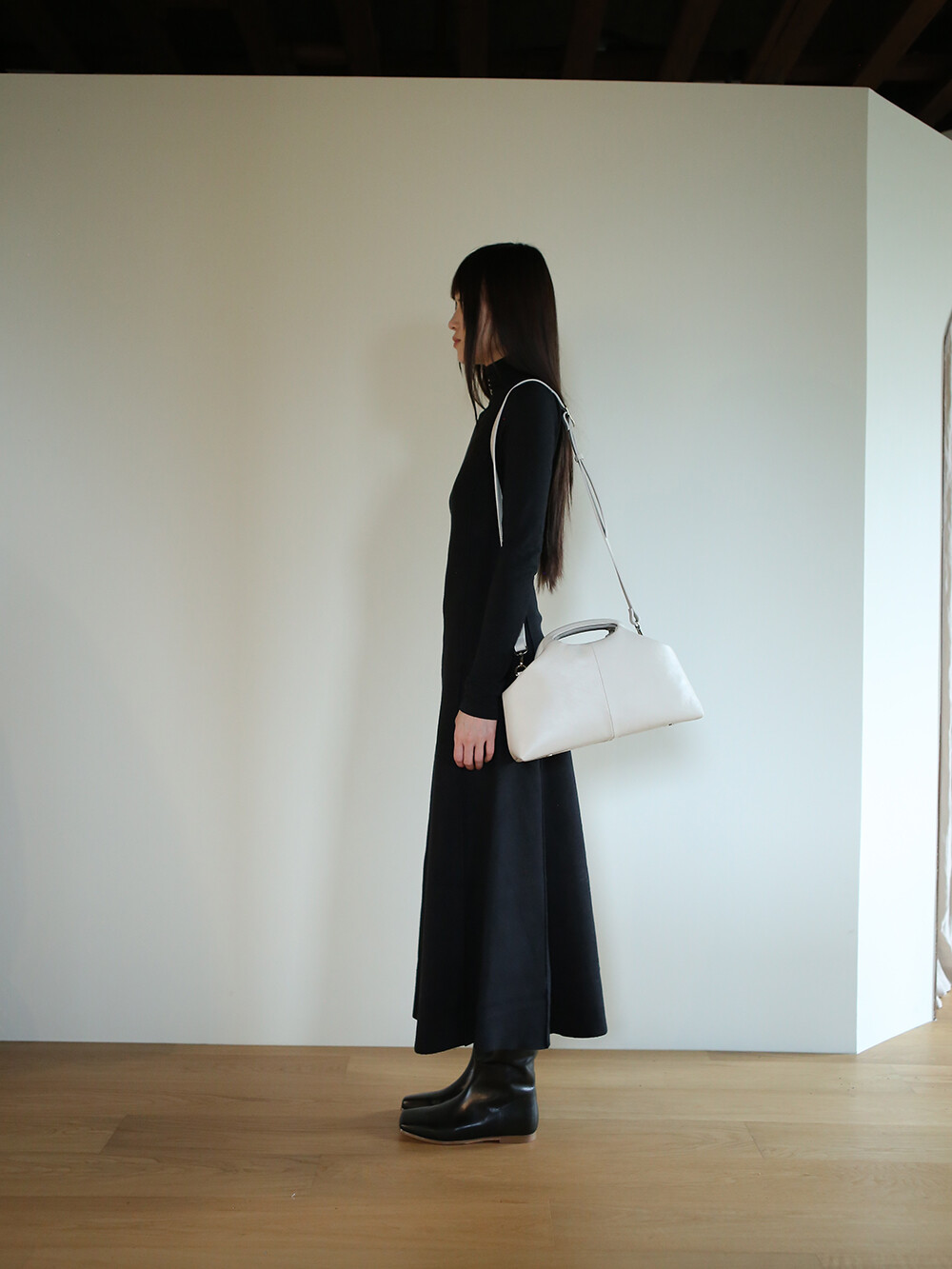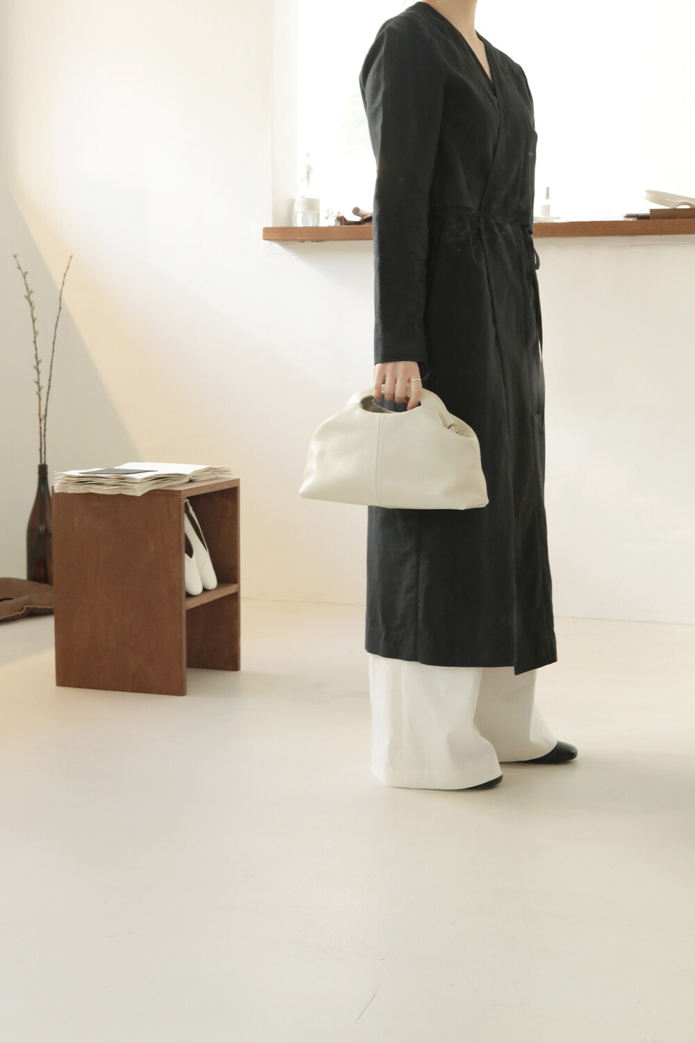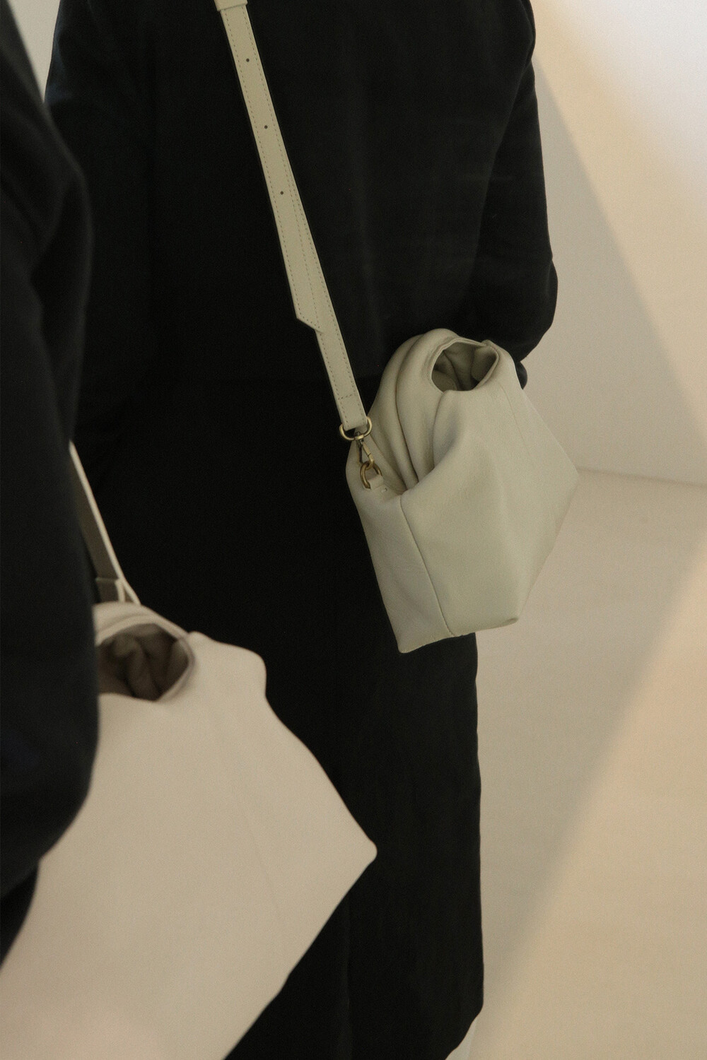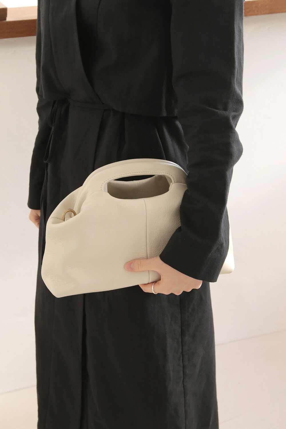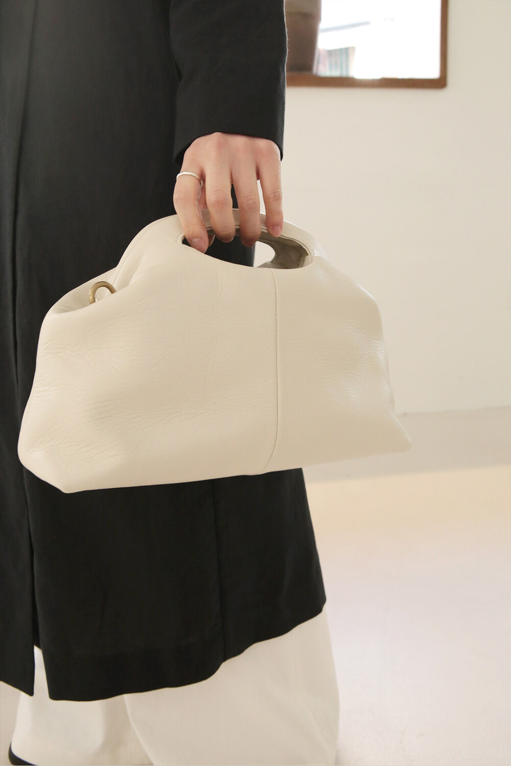 또한 프레임 연결 부분이 가죽과 맞닿아 있어, 손잡이를 오므릴 경우 초기에는 경첩에 맞물린 가죽 두께로 인해 손잡이가 살짝 벌어져 보일 수 있습니다. 이는 사용하면서 가죽이 자연스럽게 길들여지며 점차 안정적으로 여며지게 됩니다. COLOR Black, Choco, Ivory MATERIAL Cow Leather