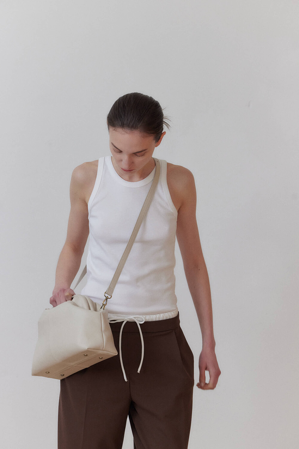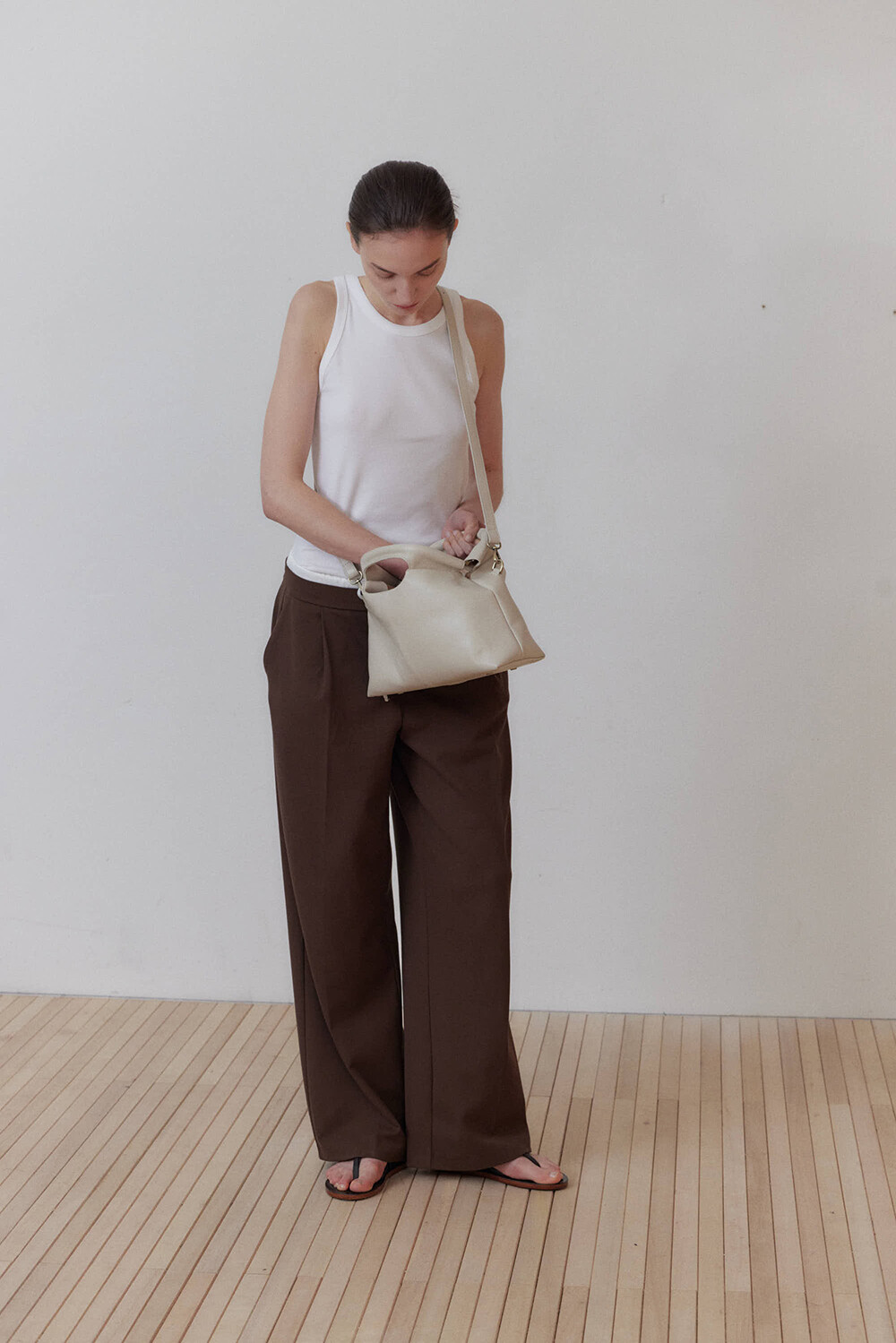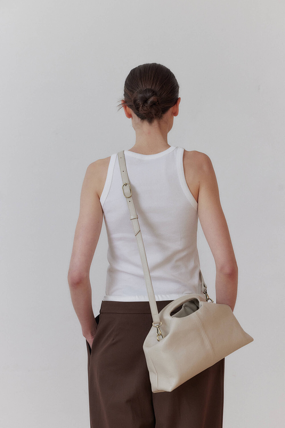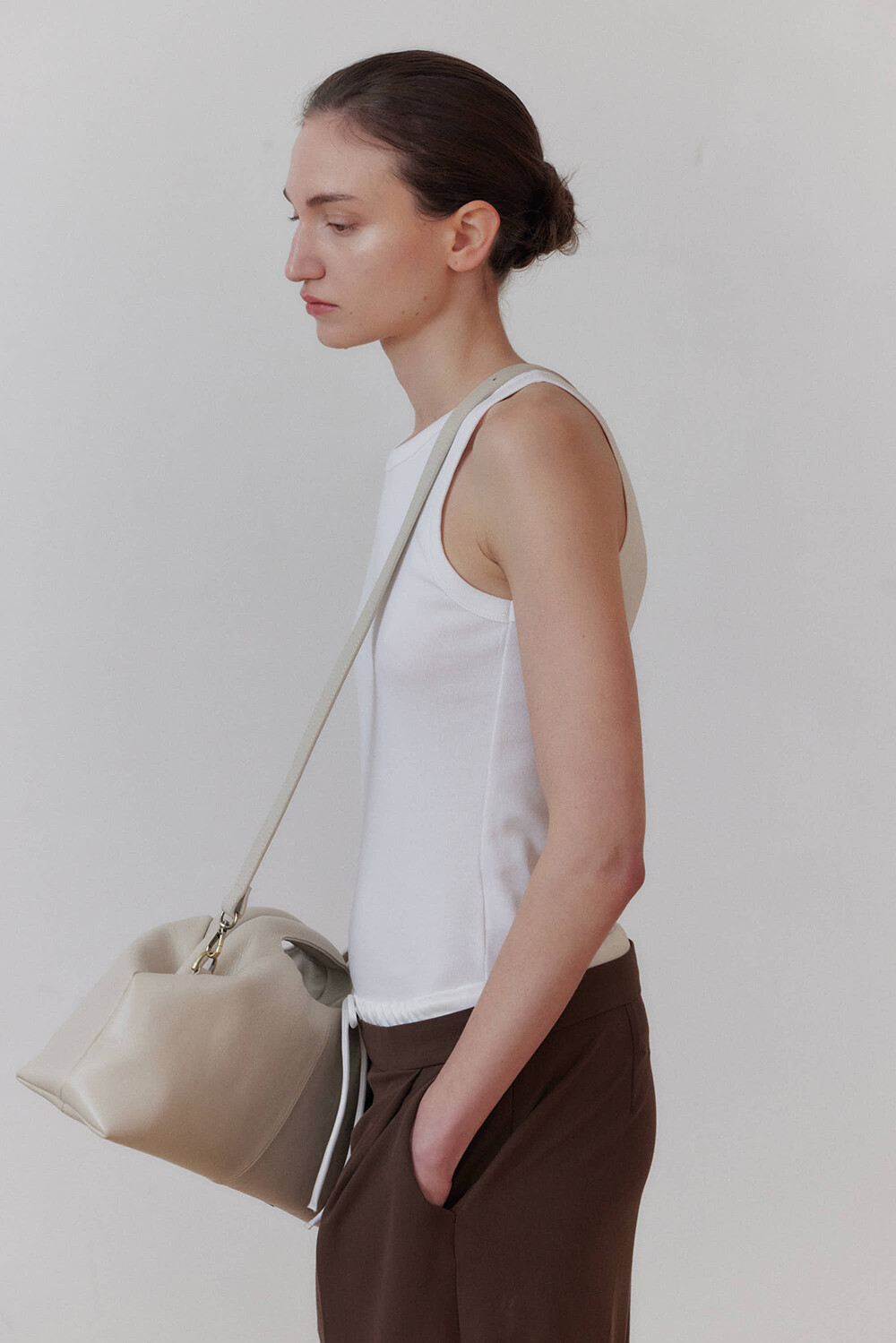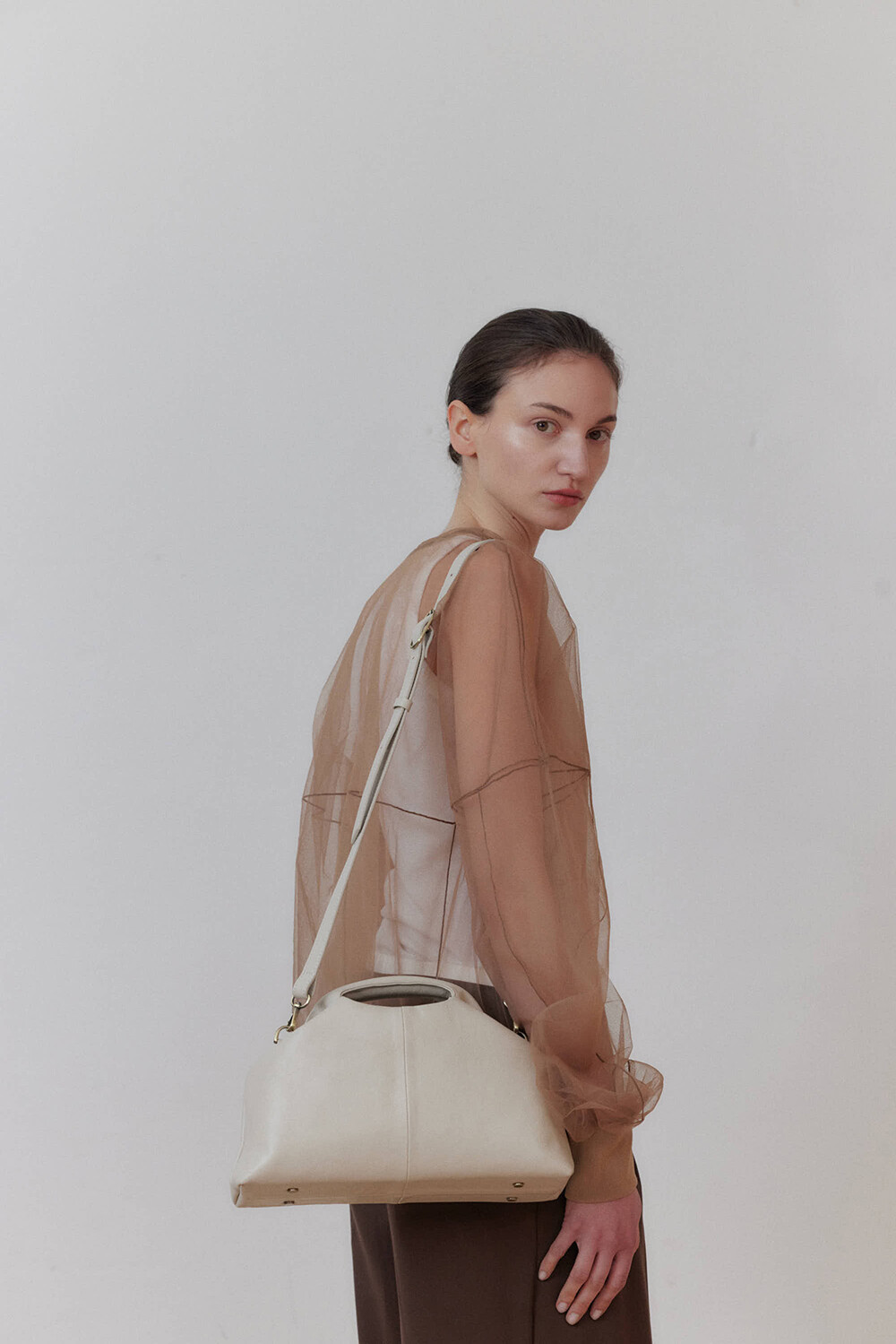 또한 프레임 연결 부분이 가죽과 맞닿아 있어, 손잡이를 오므릴 경우 초기에는 경첩에 맞물린 가죽 두께로 인해 손잡이가 살짝 벌어져 보일 수 있습니다. 이는 사용하면서 가죽이 자연스럽게 길들여지며 점차 안정적으로 여며지게 됩니다. COLOR Black, Choco, Ivory MATERIAL Cow Leather