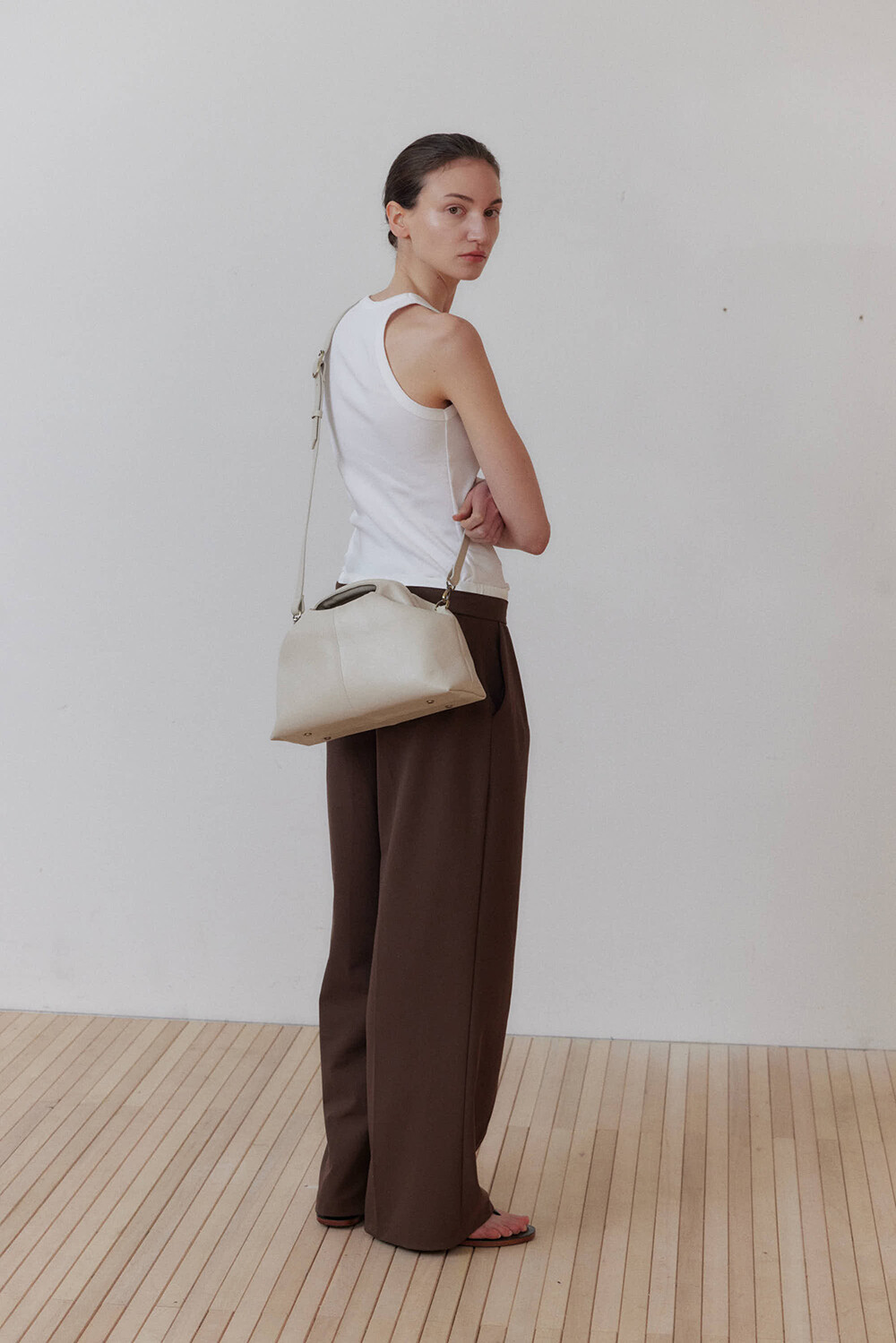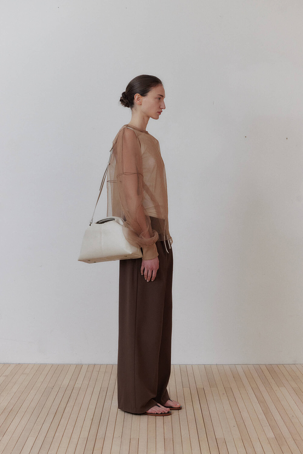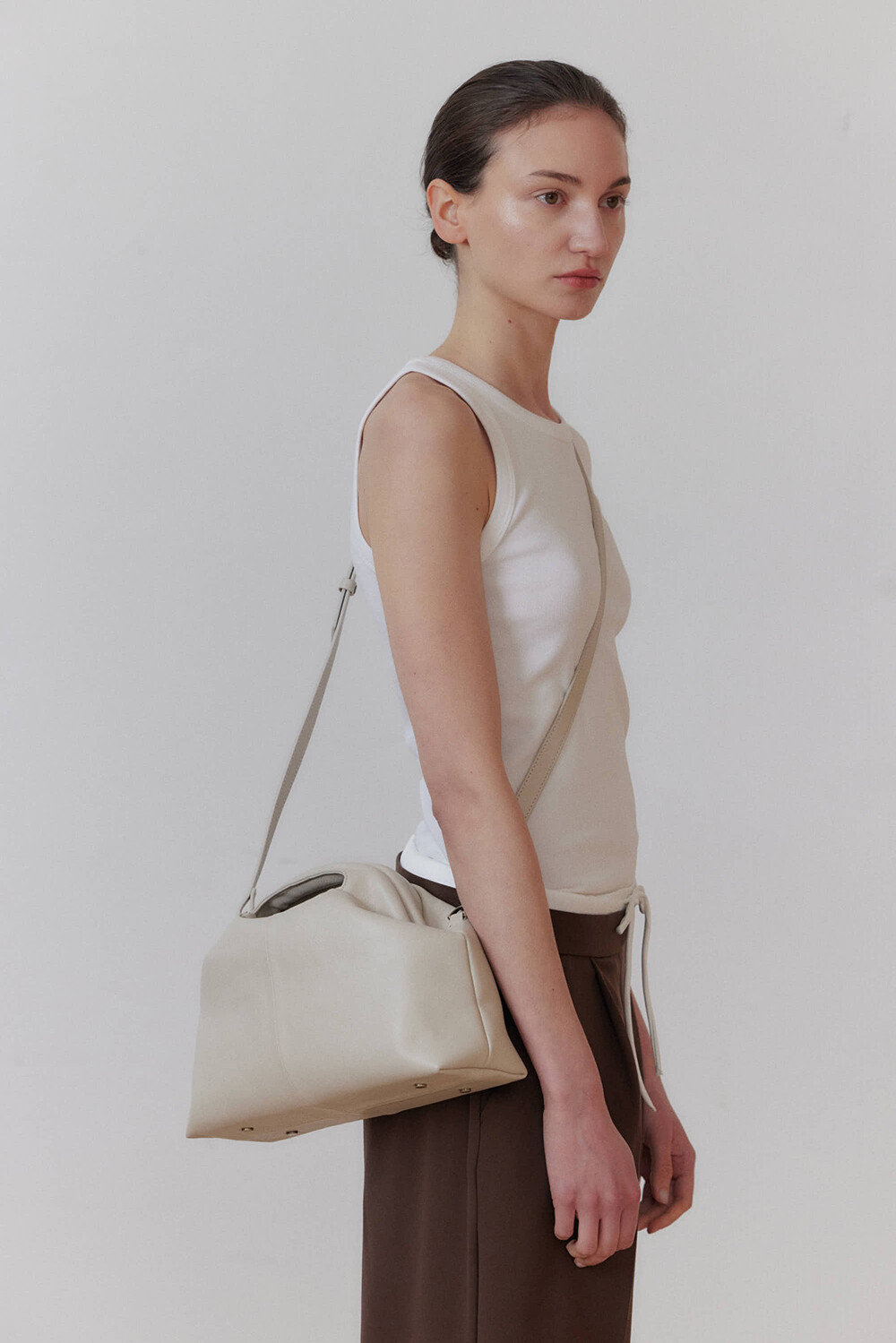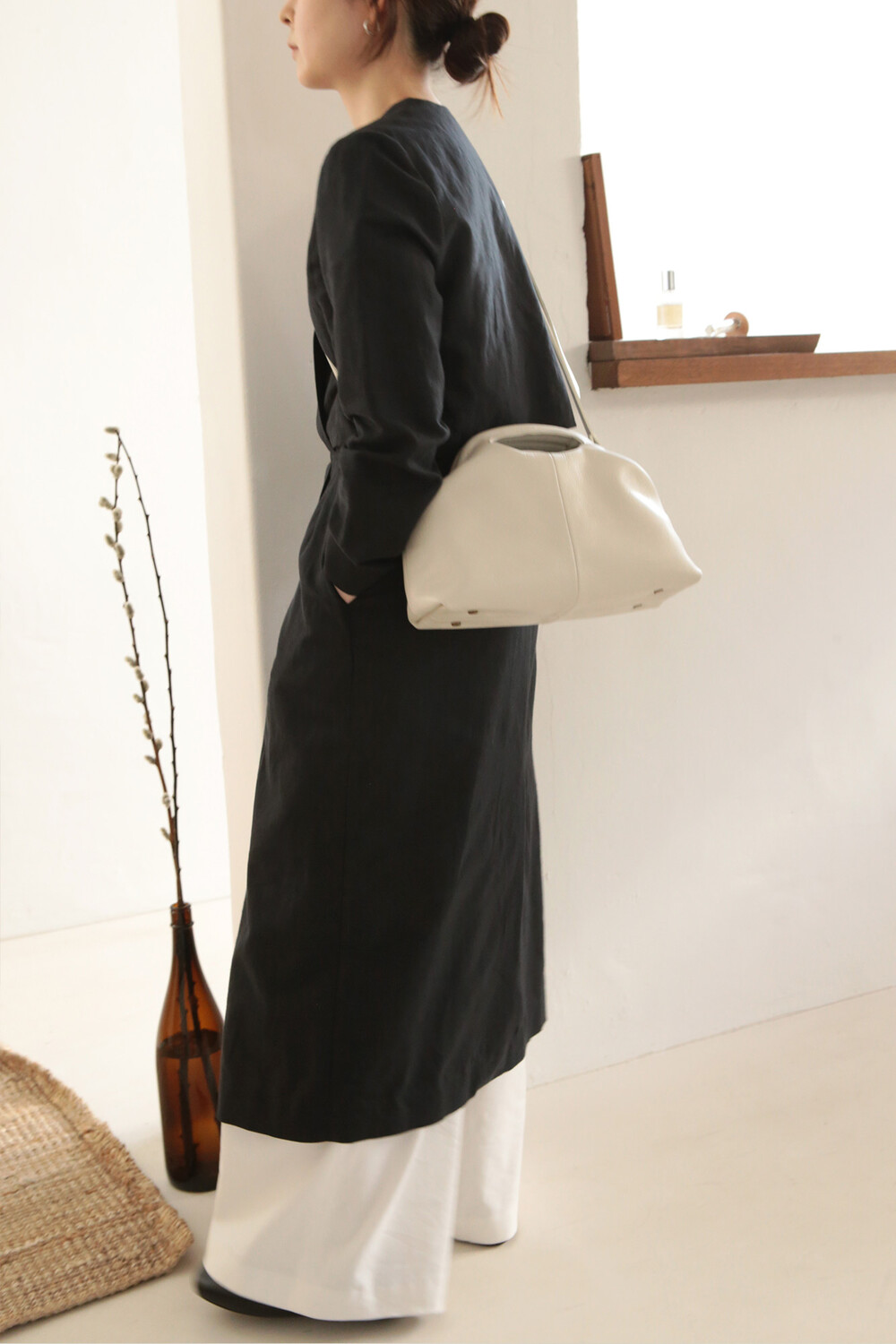 초기에는 가죽이 아직 길들여지지 않아 다소 볼륨감 있게 보일 수 있으며, 사용할수록 부드럽게 변하면서 매트한 실루엣으로 자리잡습니다.