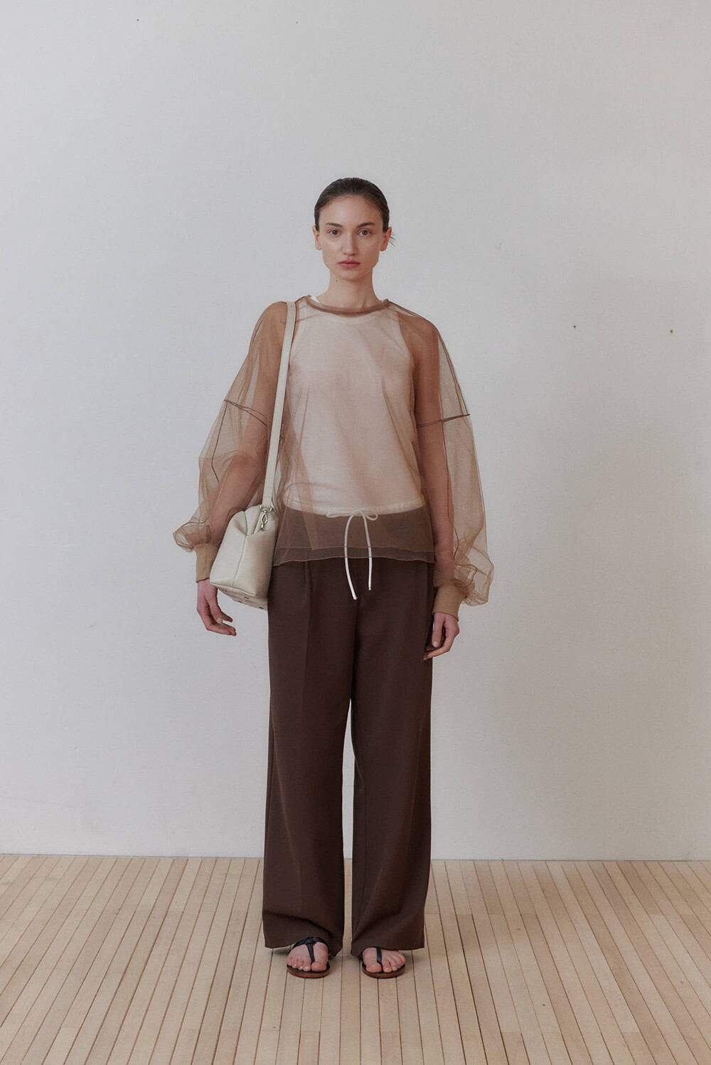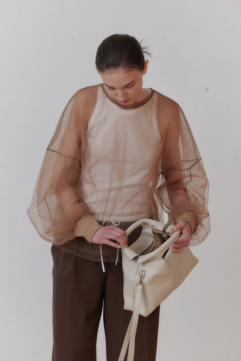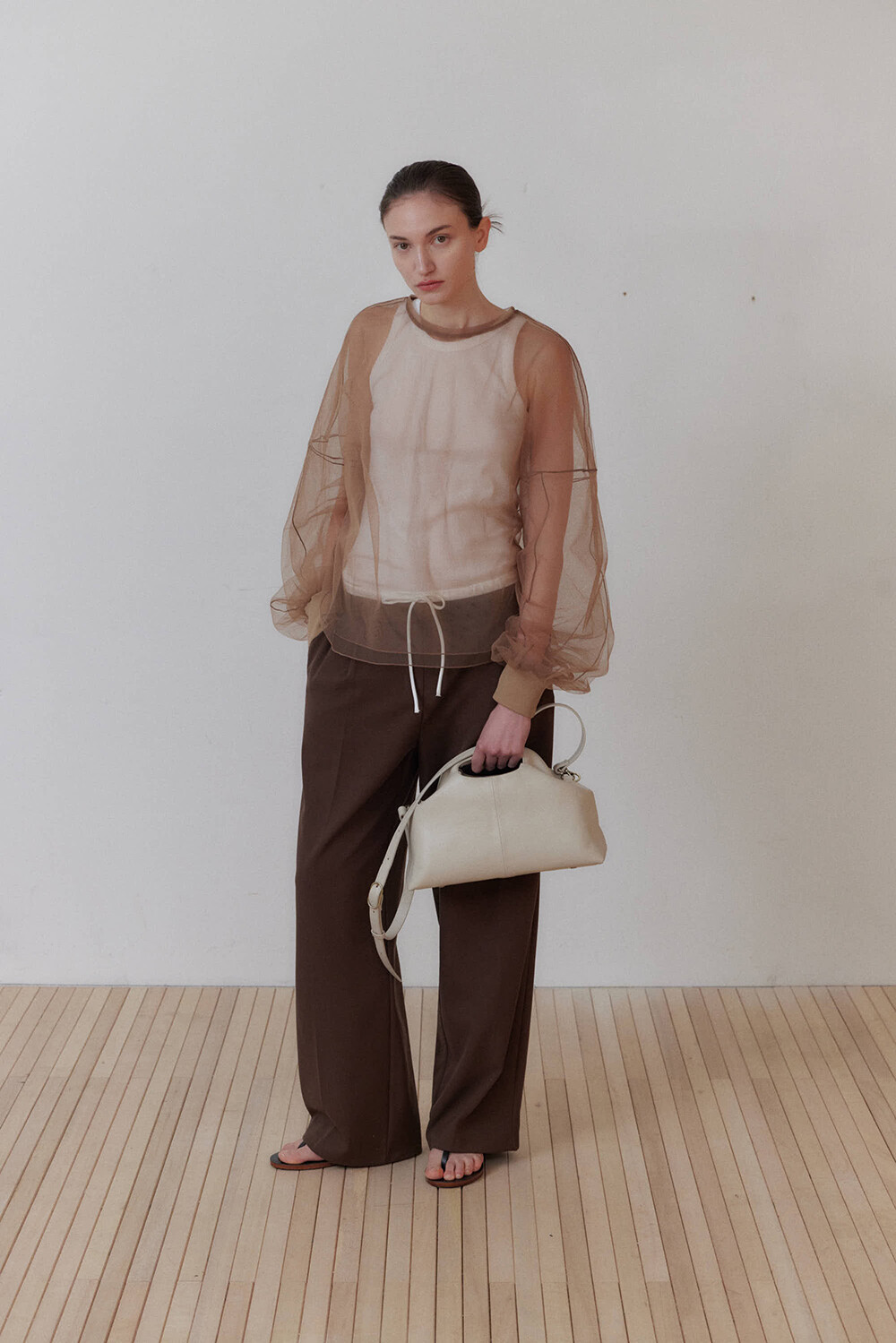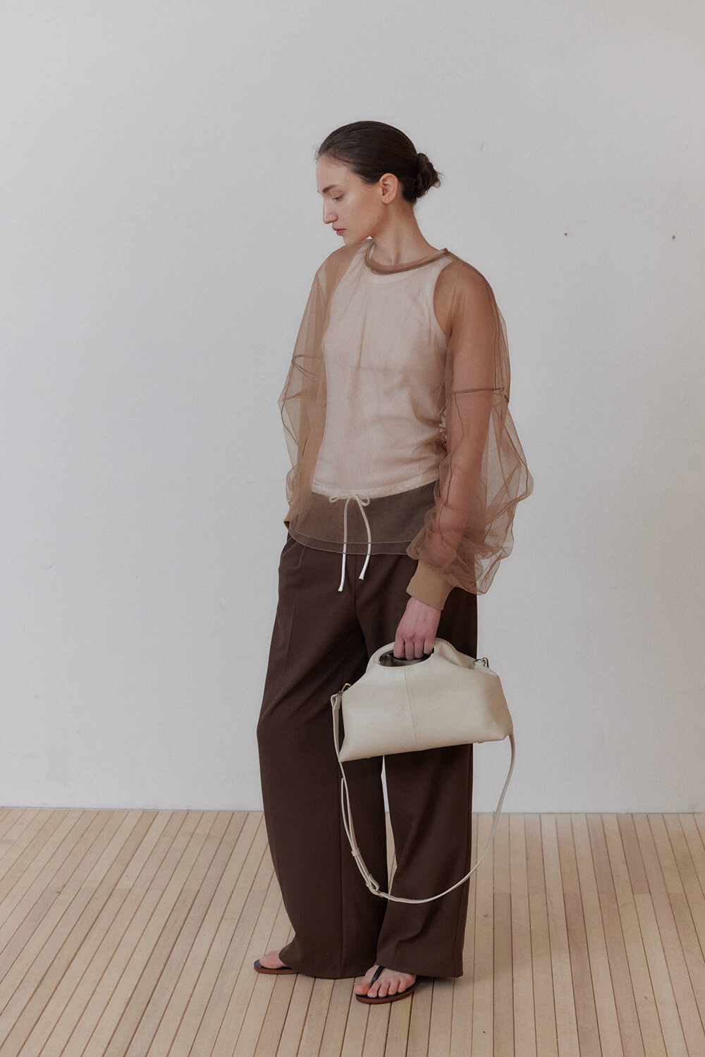 초기에는 가죽이 아직 길들여지지 않아 다소 볼륨감 있게 보일 수 있으며, 사용할수록 부드럽게 변하면서 매트한 실루엣으로 자리잡습니다.
