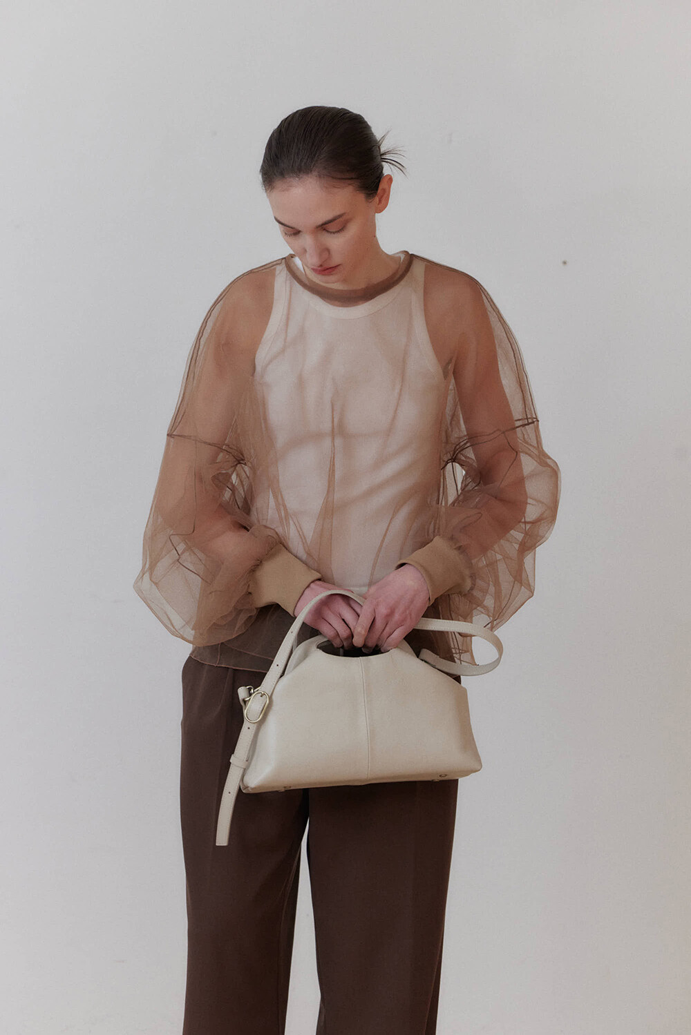 유르트만의 독특한 디자인, 누오입니다. 조개 혹은 반달을 닮은 듯한 유니크한 실루엣과, 자체 제작한 고급 프레임 손잡이와 여닫이 구조가 특징입니다.