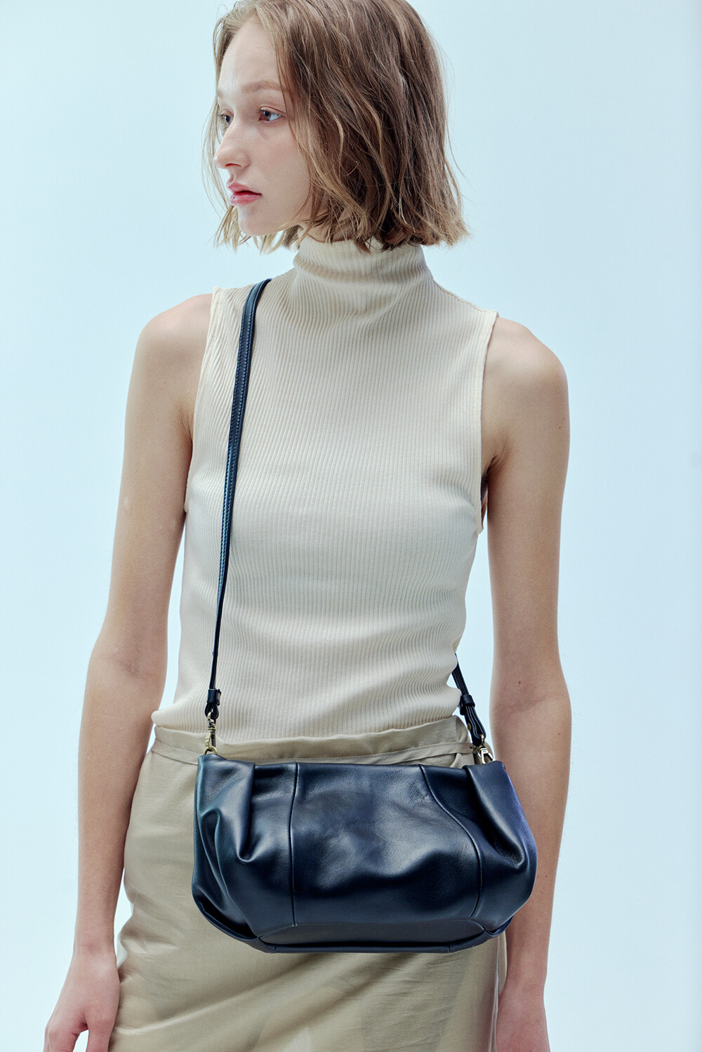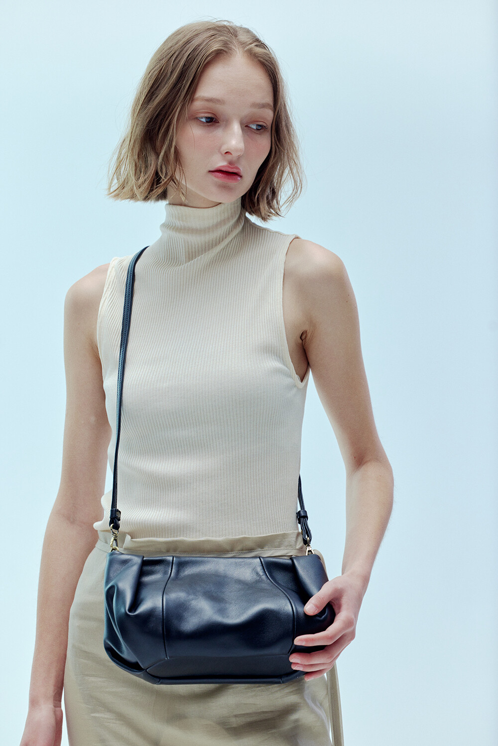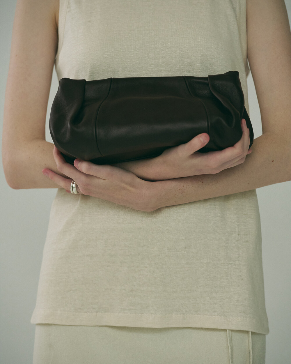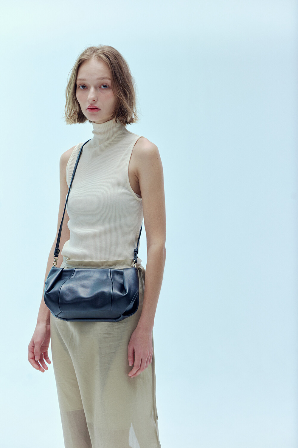 피망의 단면을 떠올리게 하는 부드러운 양가죽 가방입니다. 입구 부분과 밑면의 턱이 반대 방향으로 잡히며 만들어지는 실루엣이 매력입니다. 바네 프레임을 사용하여 여닫기에 편리하며 프레임을 안으로 숨겨 입구에 유연한 느낌을 더했습니다.