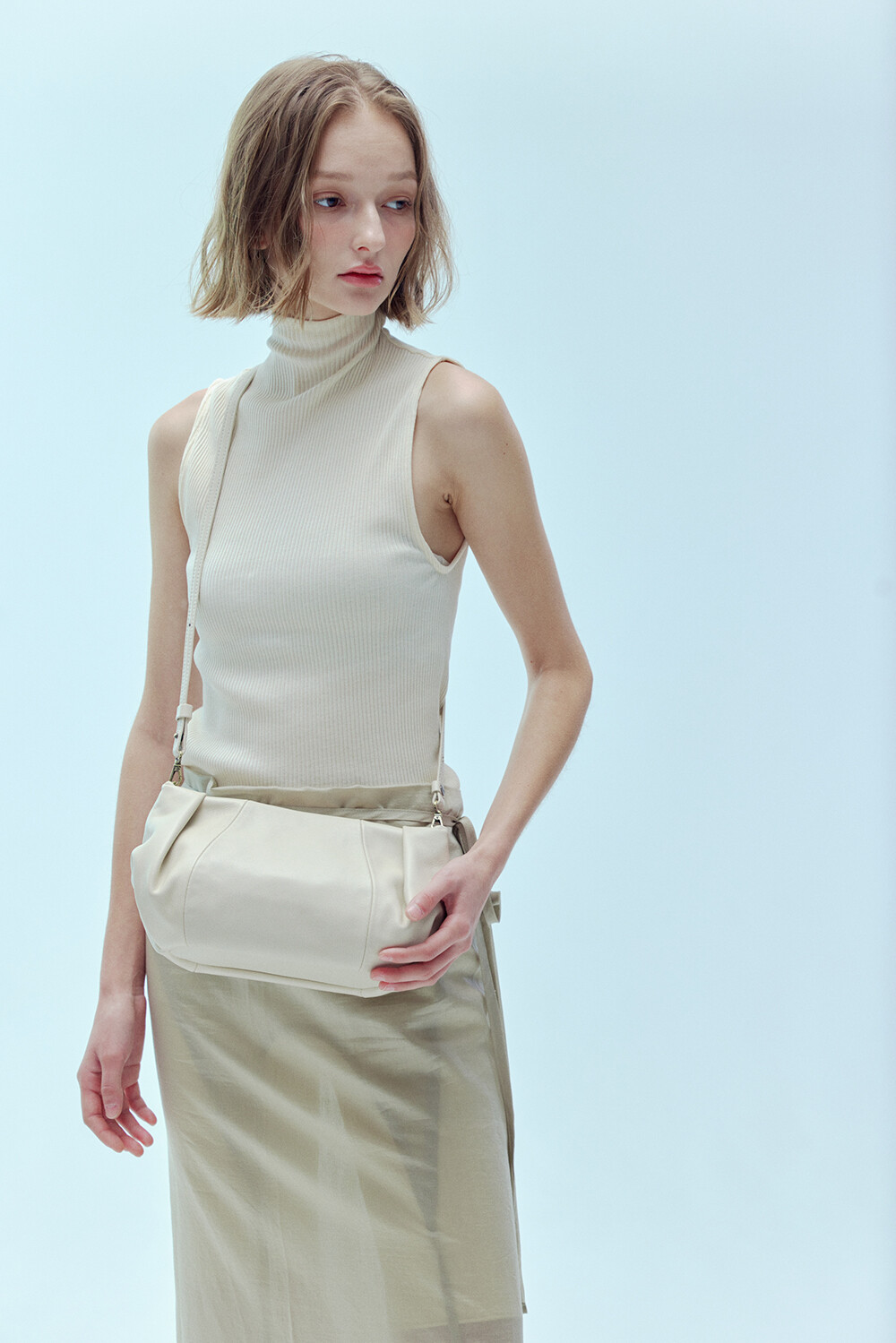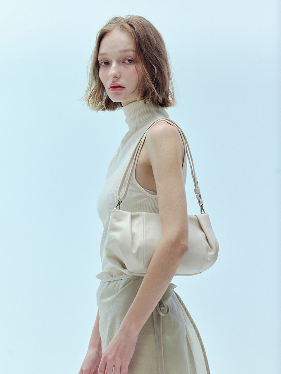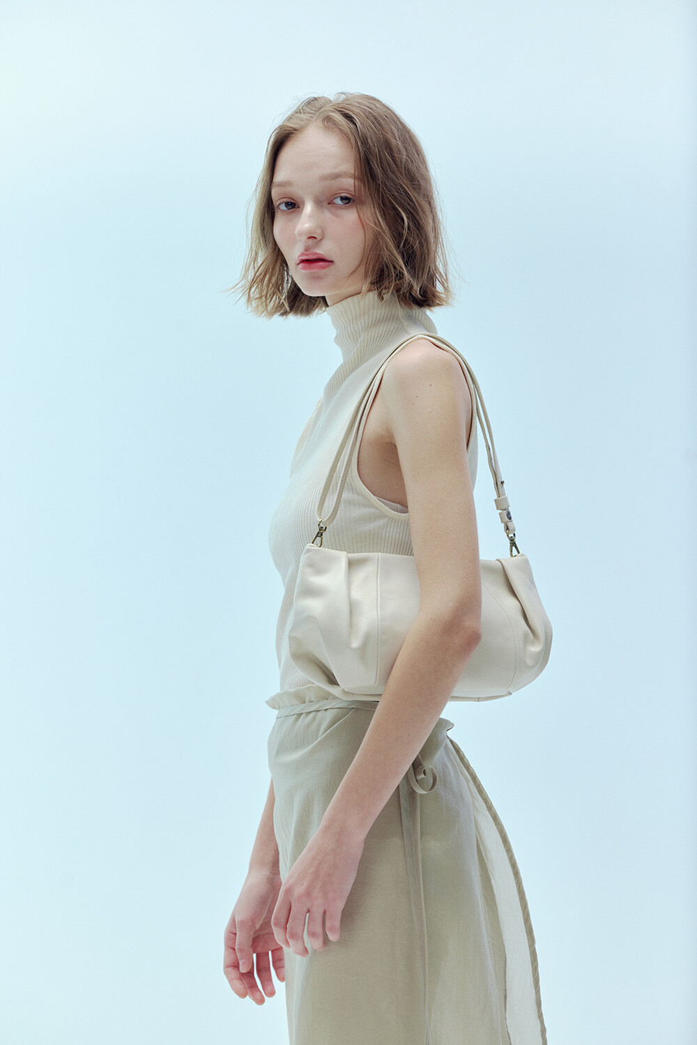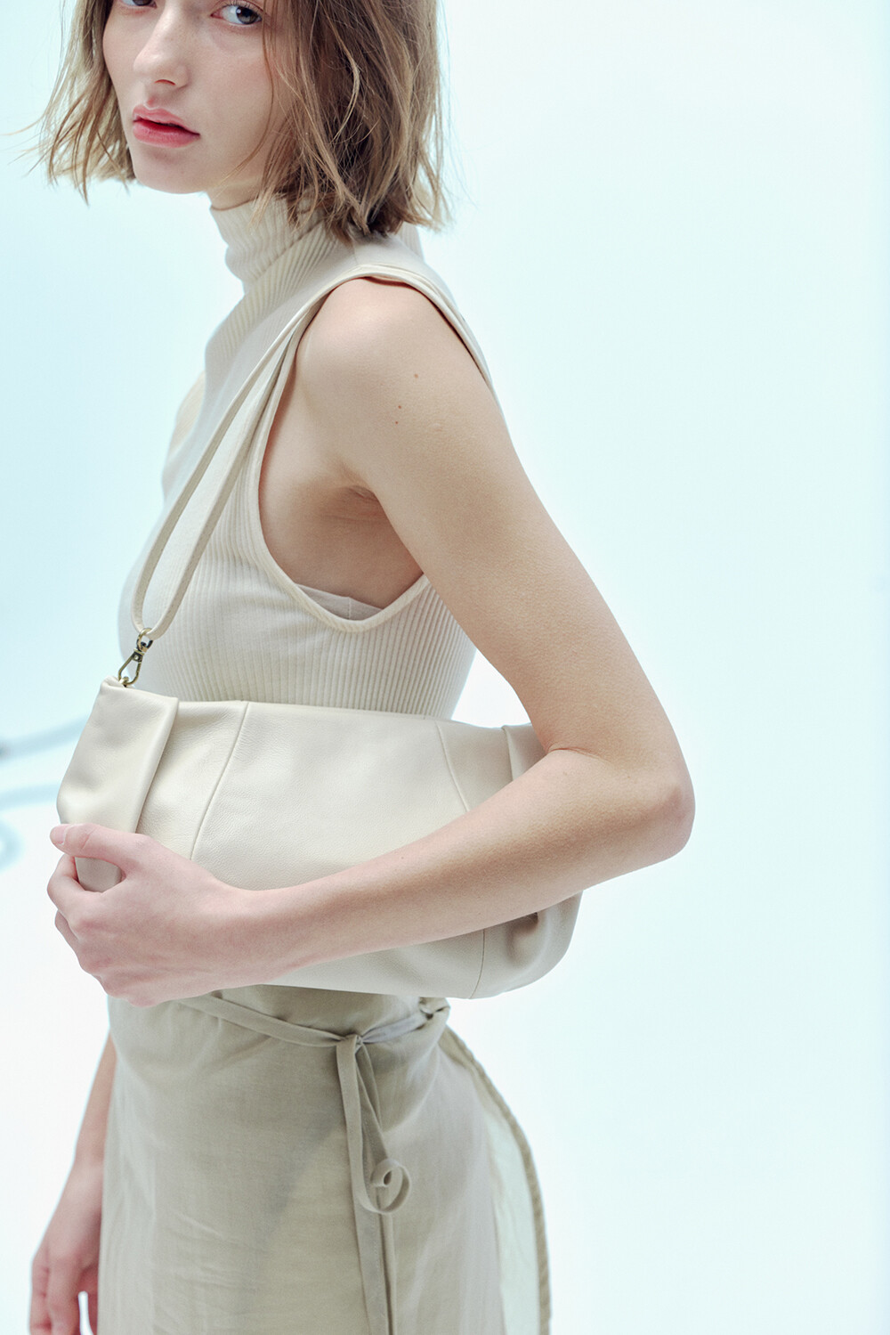 피망의 단면을 떠올리게 하는 부드러운 양가죽 가방입니다. 입구 부분과 밑면의 턱이 반대 방향으로 잡히며 만들어지는 실루엣이 매력입니다. 바네 프레임을 사용하여 여닫기에 편리하며 프레임을 안으로 숨겨 입구에 유연한 느낌을 더했습니다.