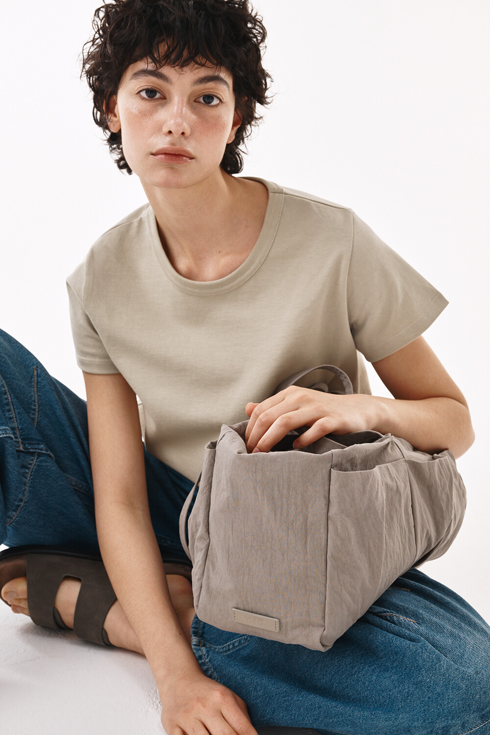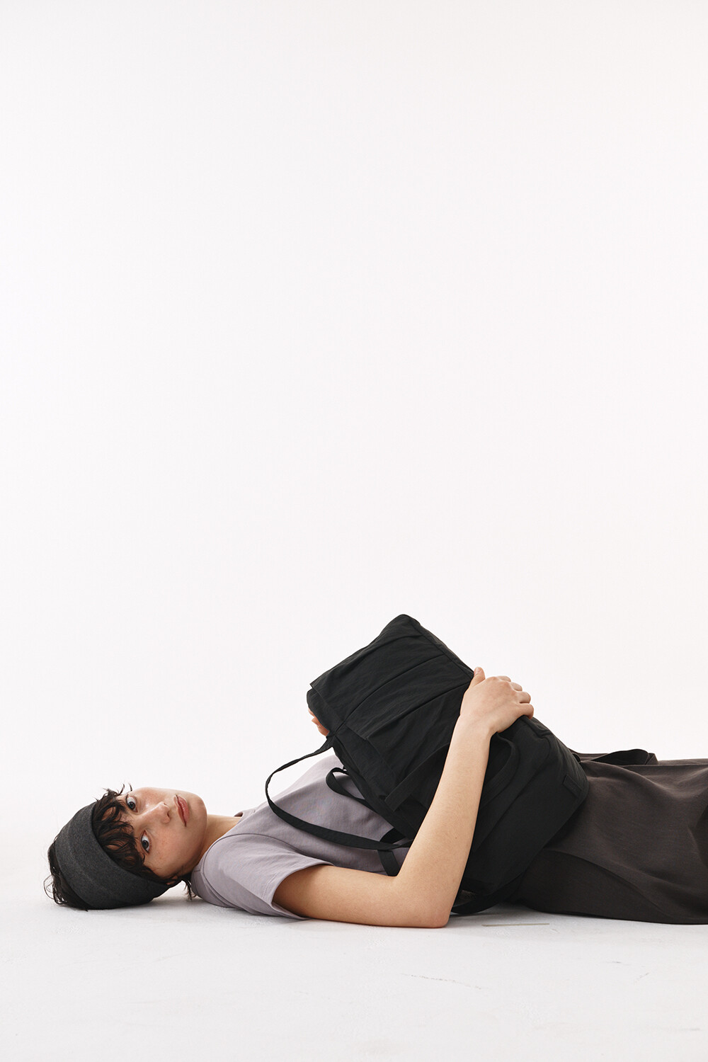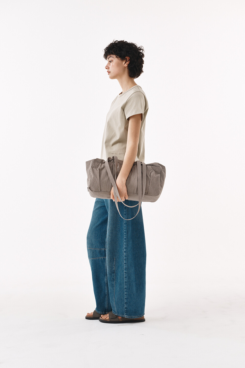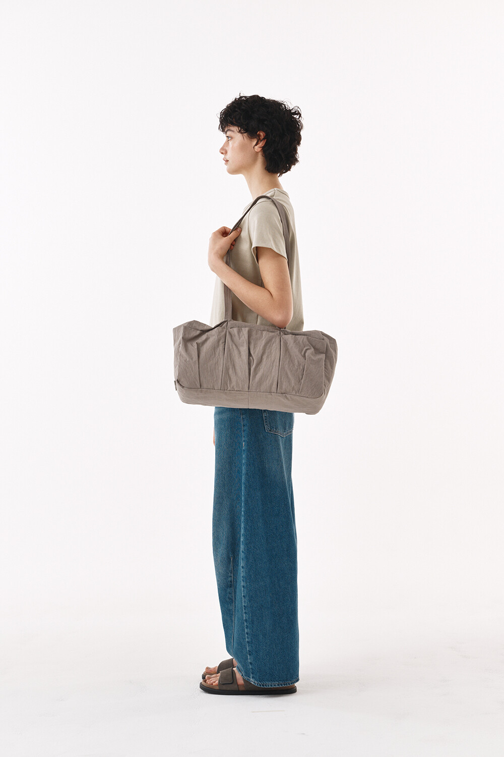 - 겉으로 보이는 봉제를 최소화하고 원단을 접어서 스트랩을 숨겨 간결한 디자인으로 완성하고 동시에 주름진 포켓이 만들어지는 디테일을 더했습니다.