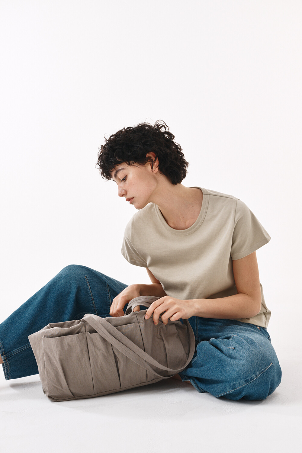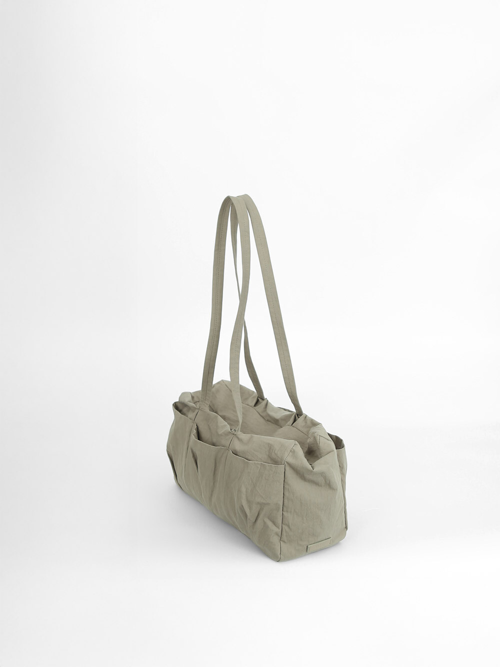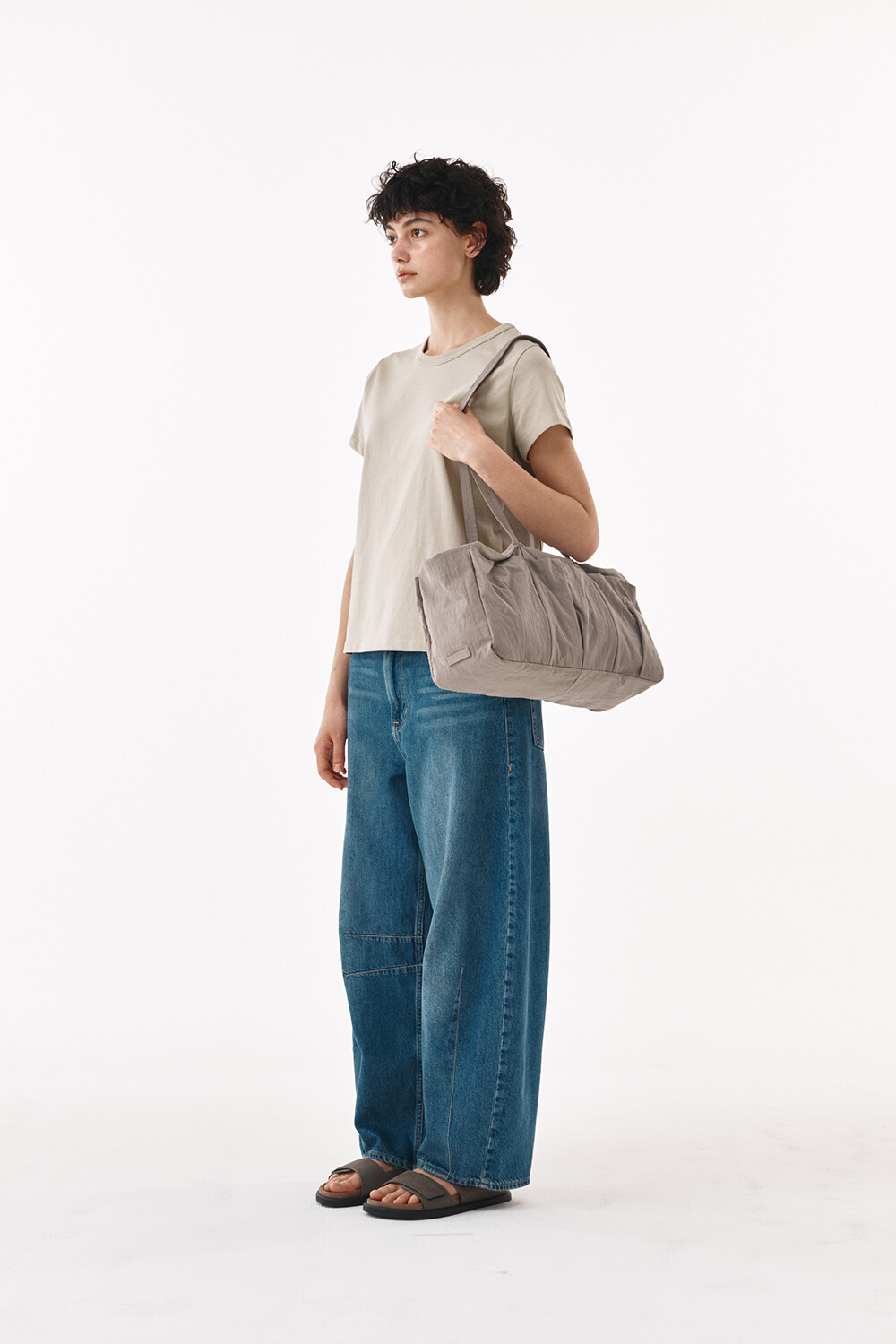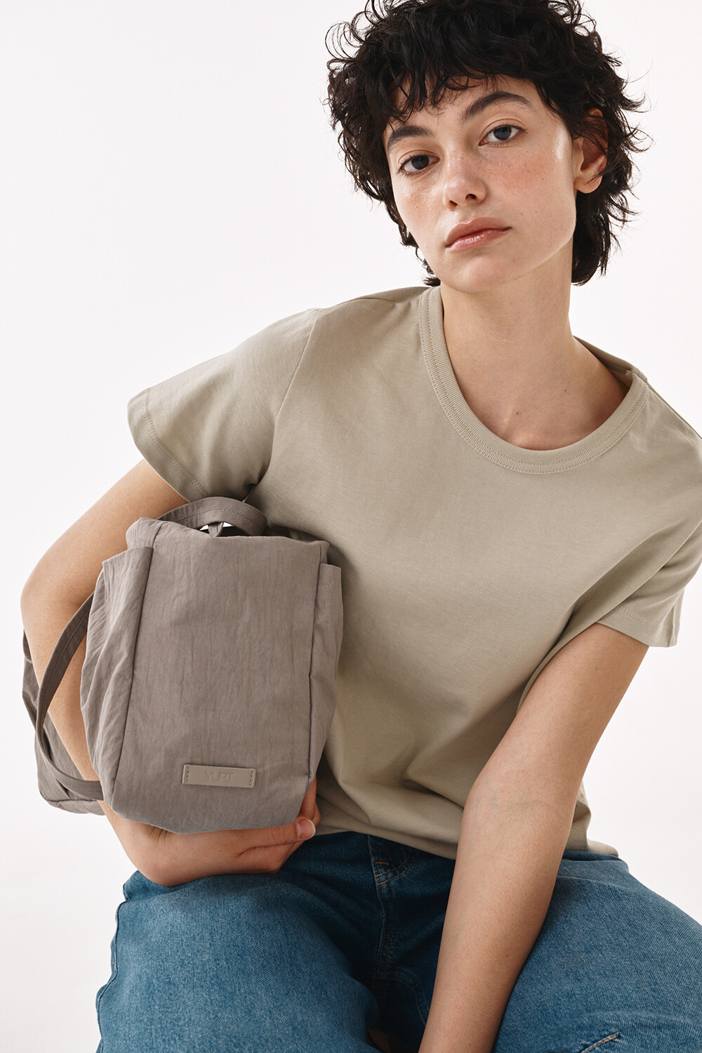 - 겉으로 보이는 봉제를 최소화하고 원단을 접어서 스트랩을 숨겨 간결한 디자인으로 완성하고 동시에 주름진 포켓이 만들어지는 디테일을 더했습니다.