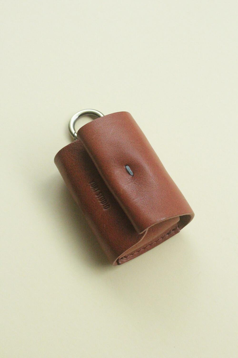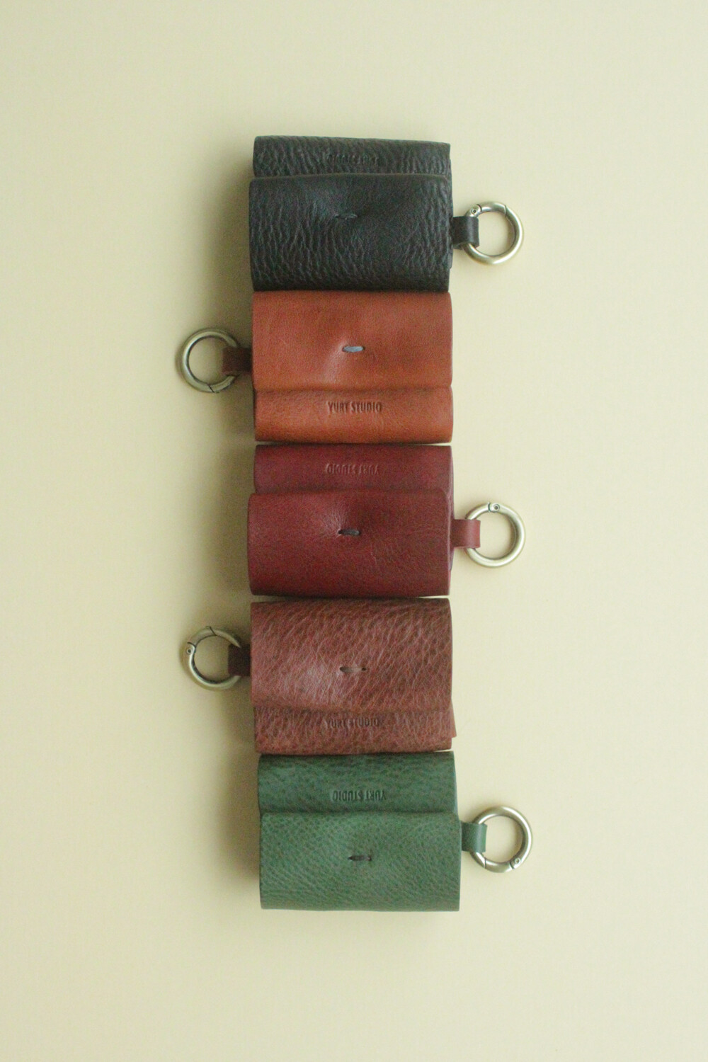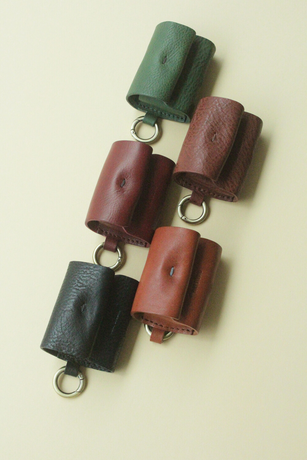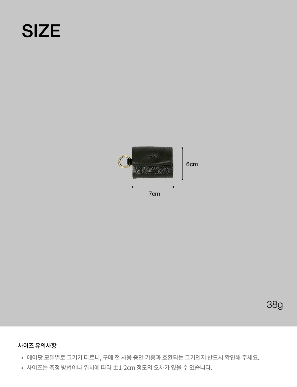 한 손에 들어오는 작은 사이즈지만 입체적인 디자인으로 에어팟을 알맞게 수납하실 수 있습니다. 케이스를 씌운 상태에서 바로 충전이 가능하도록 하단에 충전 구멍을 내어 실용성을 높이고 스냅 버튼을 달아 안전하게 열고 닫을 수 있도록 완성했습니다. 탈부착이 가능한 O 링 고리로 가방에 달아 키링으로 활용하실 수 있는 매력을 가지고 있습니다. 블랙, 카멜, 그린, 브라운, 멀베리 총 5가지의 다채로운 색상으로 만나 보세요.