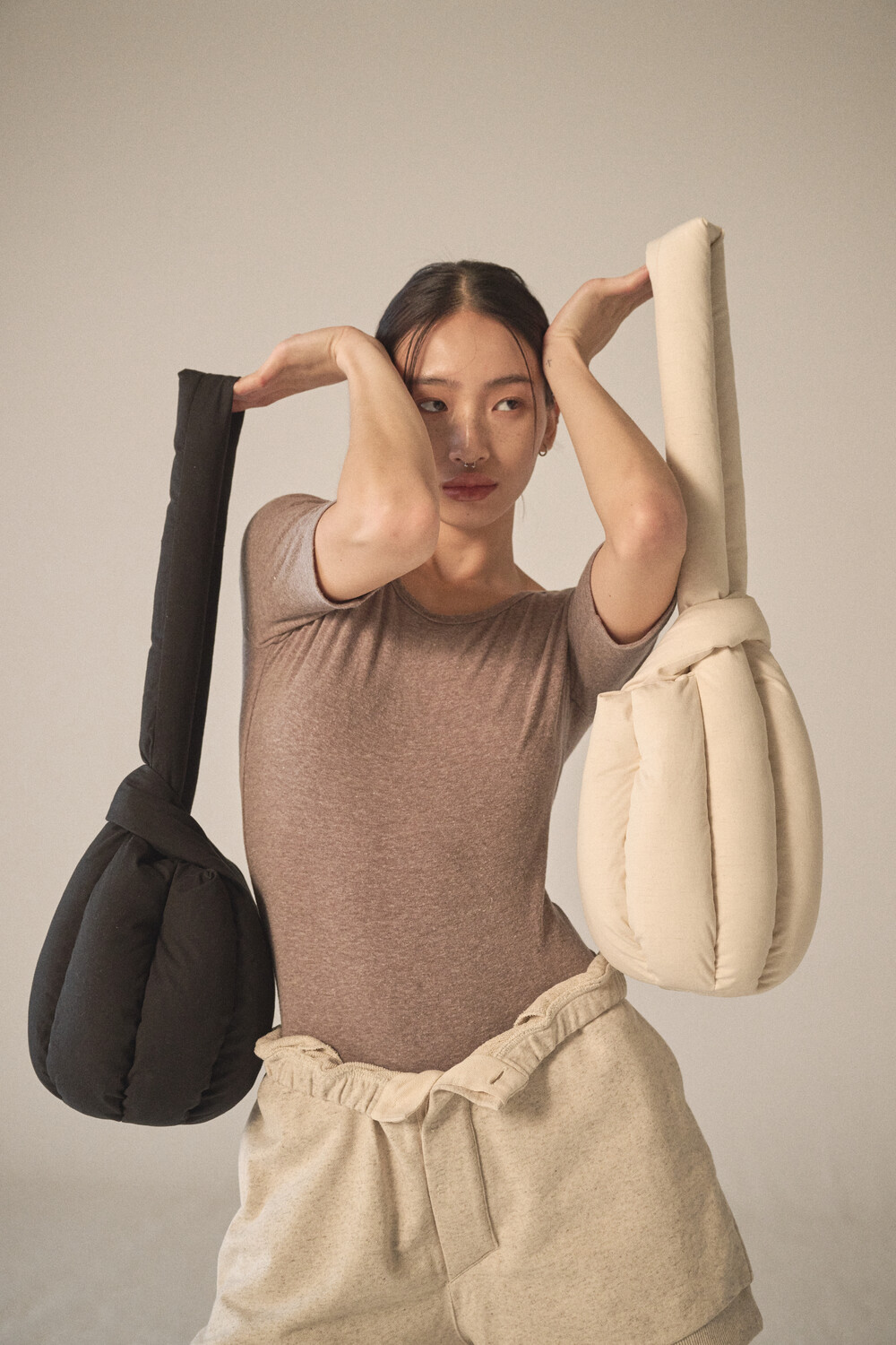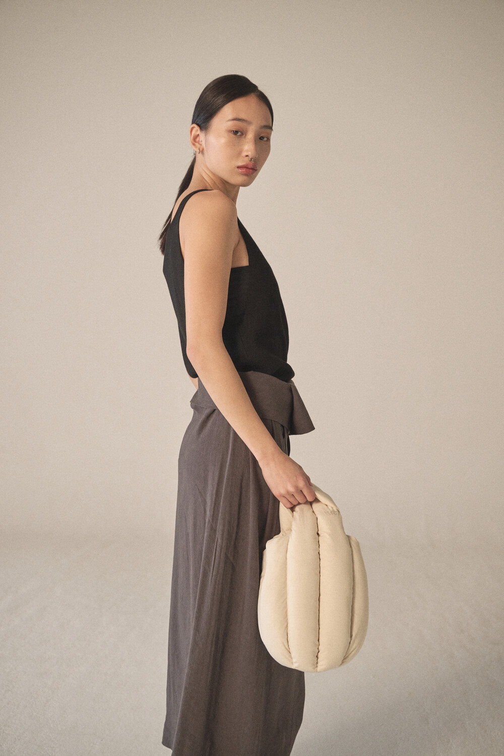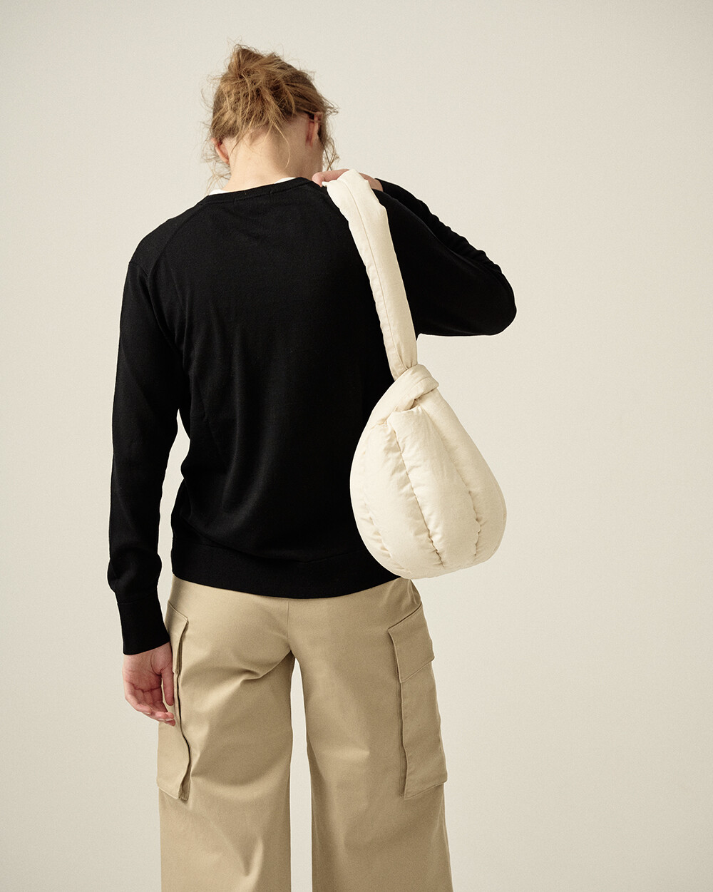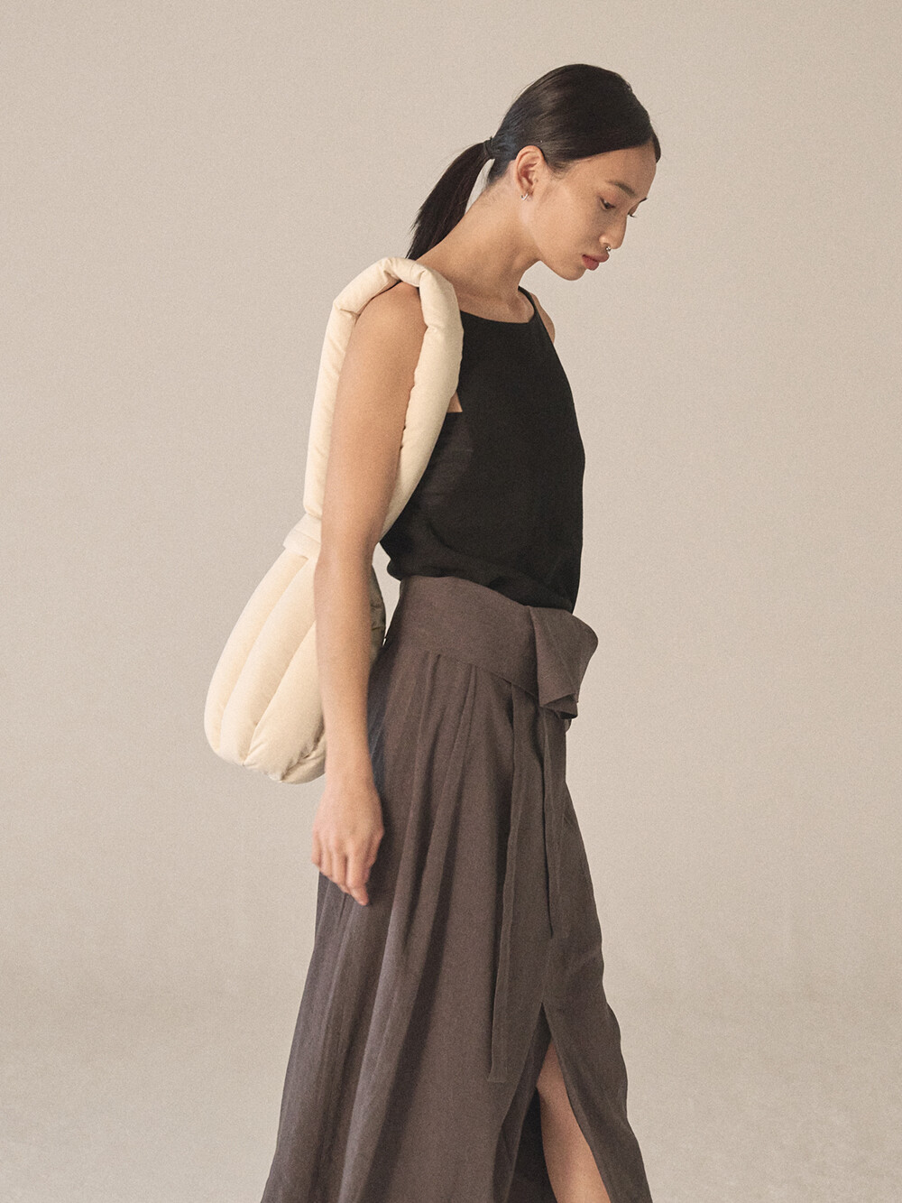 - 숄더 혹은 토트로 착용할 수 있도록 제작되었으며, 길이가 다른 두 스트랩을 엮어서 여미는 구조