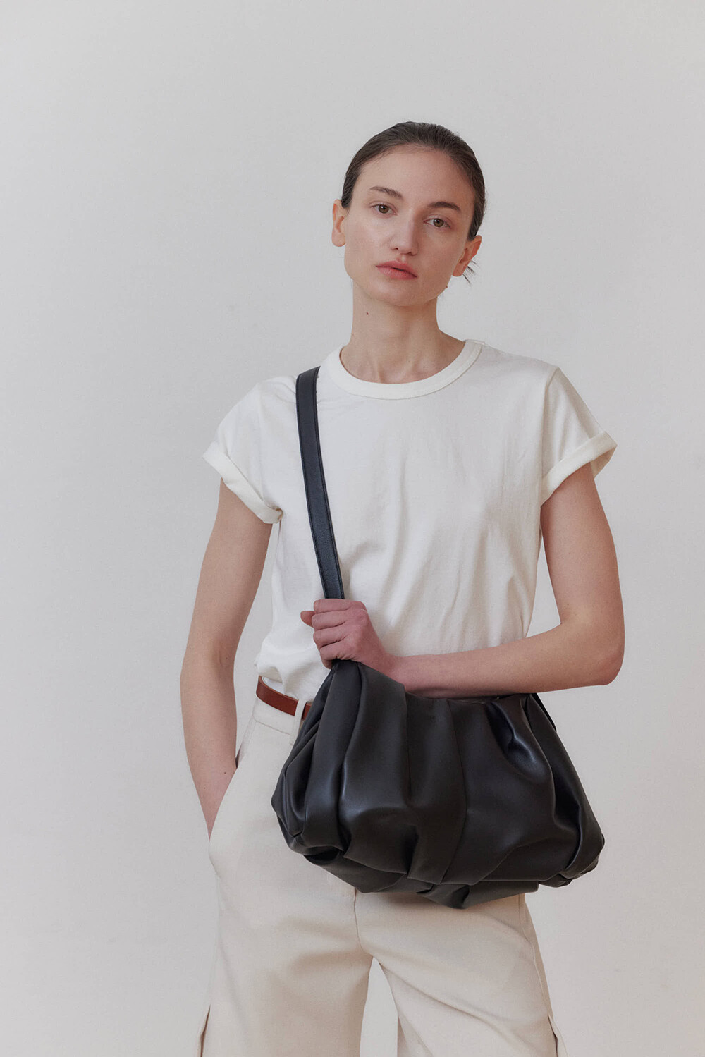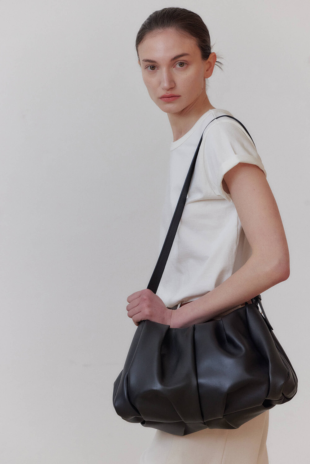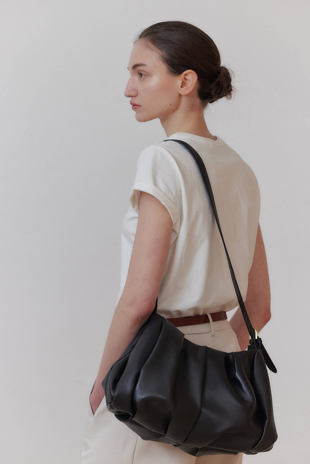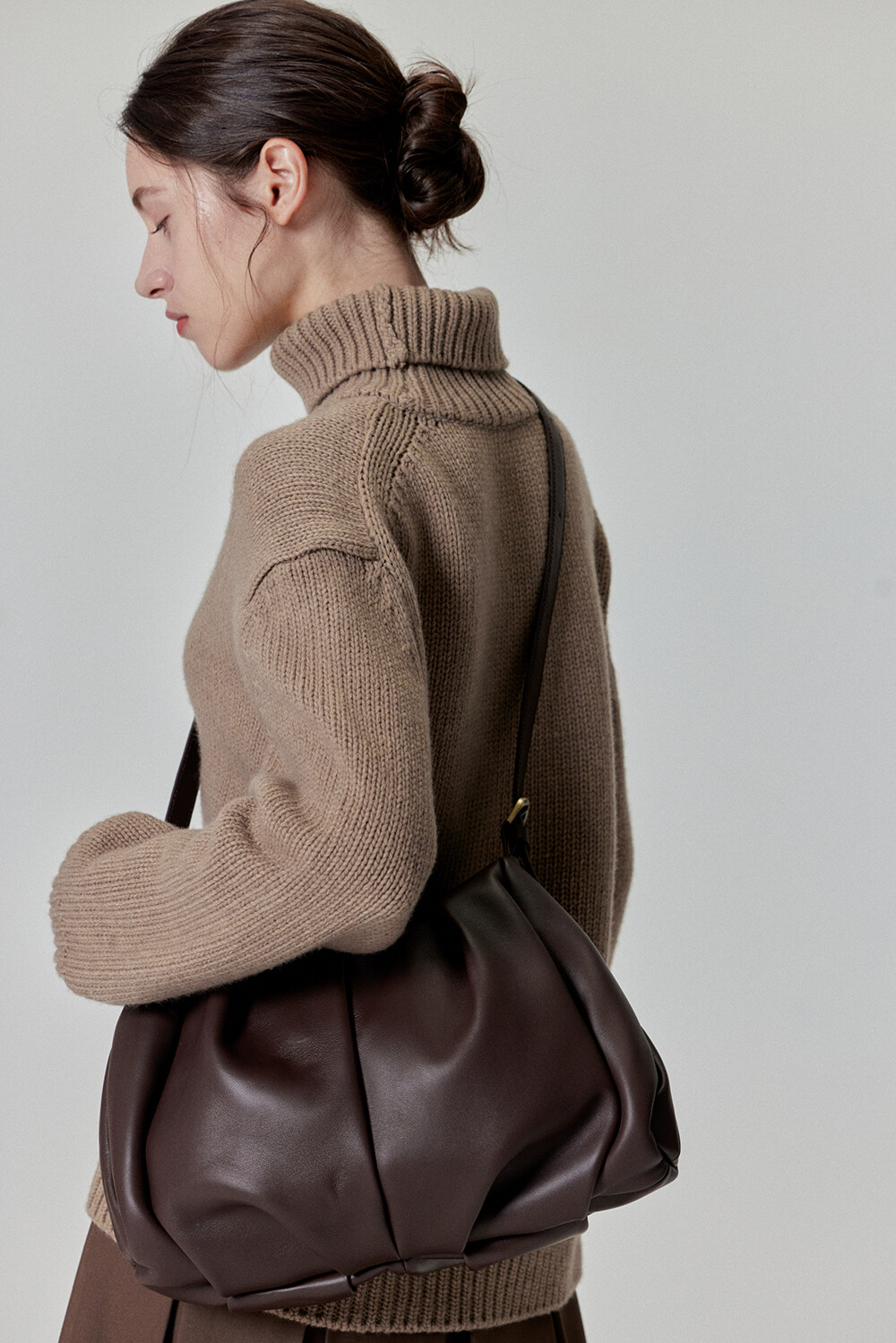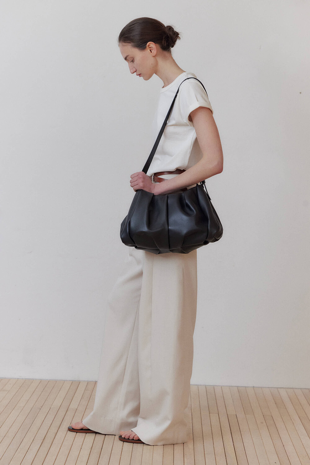 - 부드러운 양가죽을 드레이핑하여 흐르는 결의 실루엣을 극대화한 데일리백입니다.
