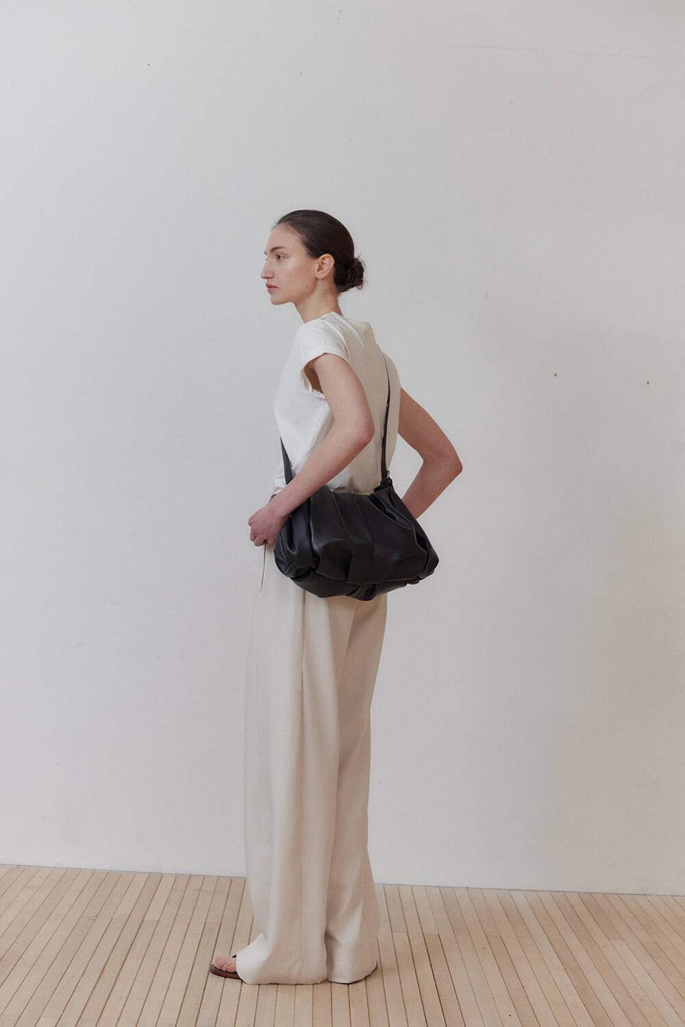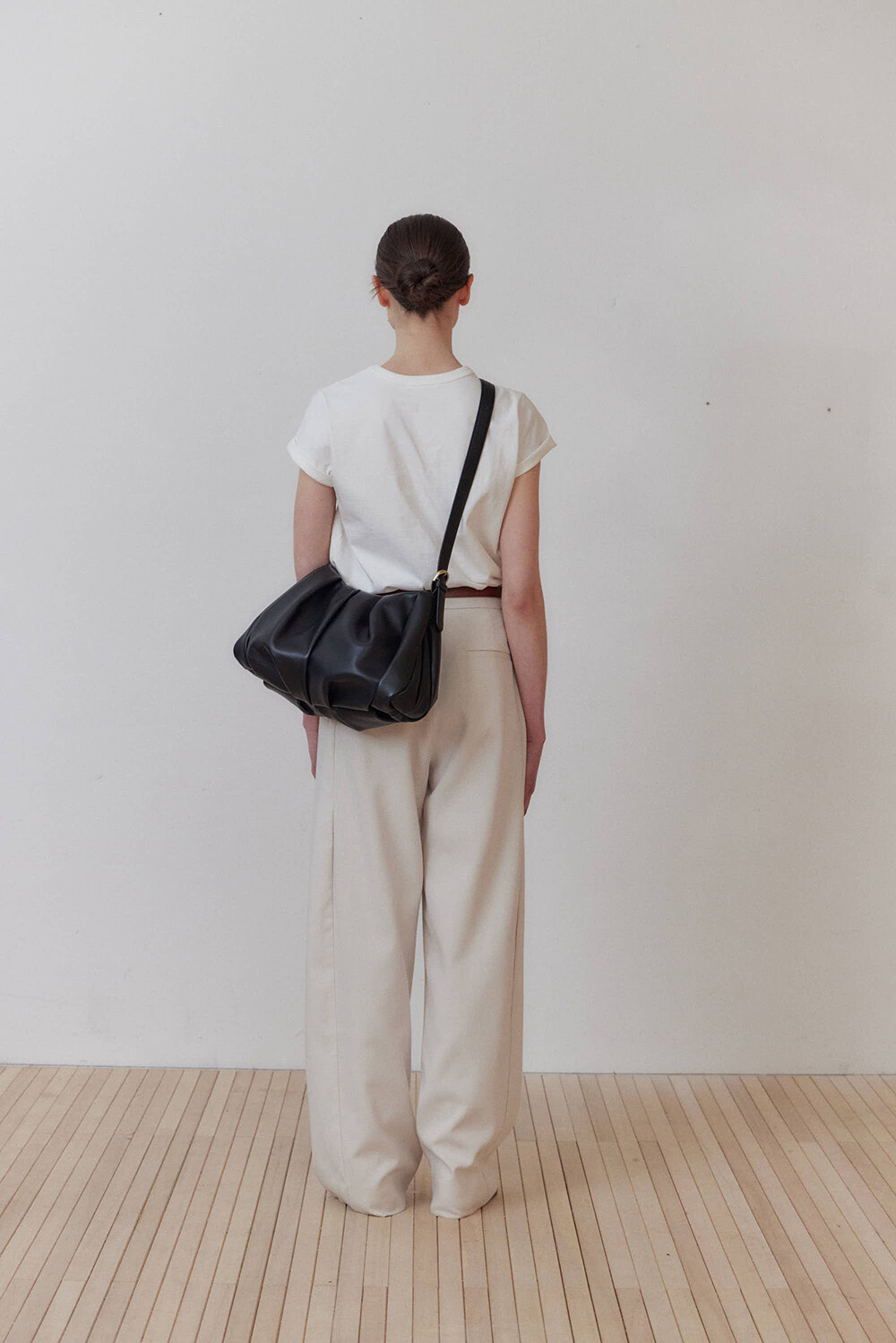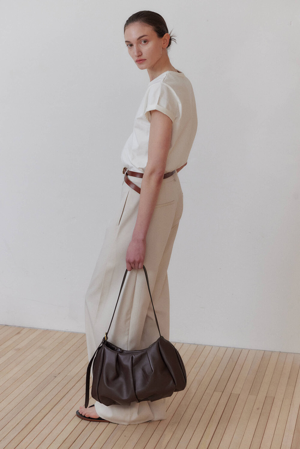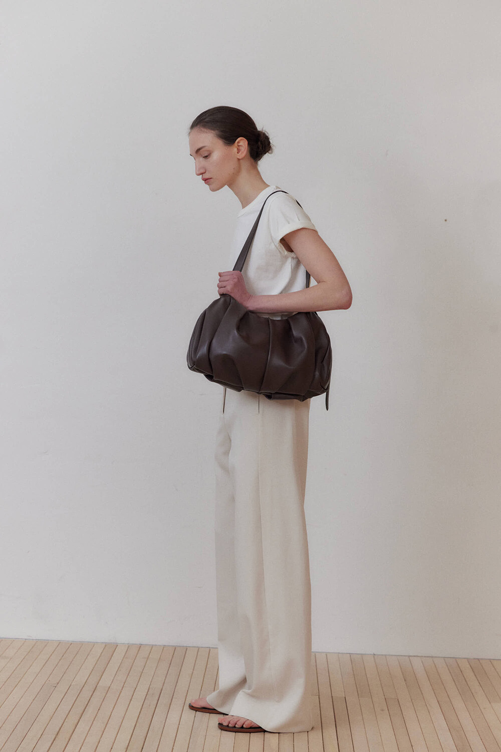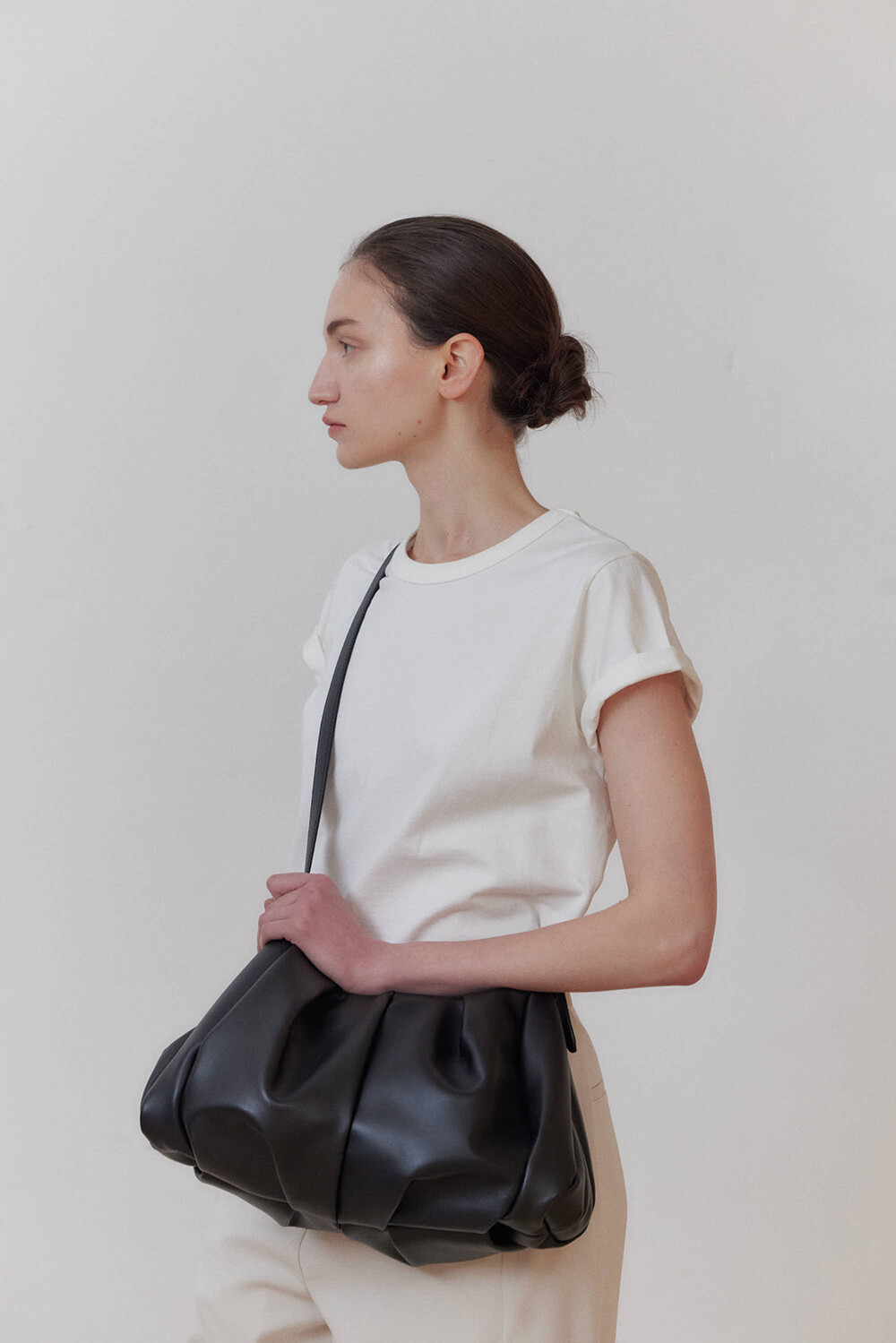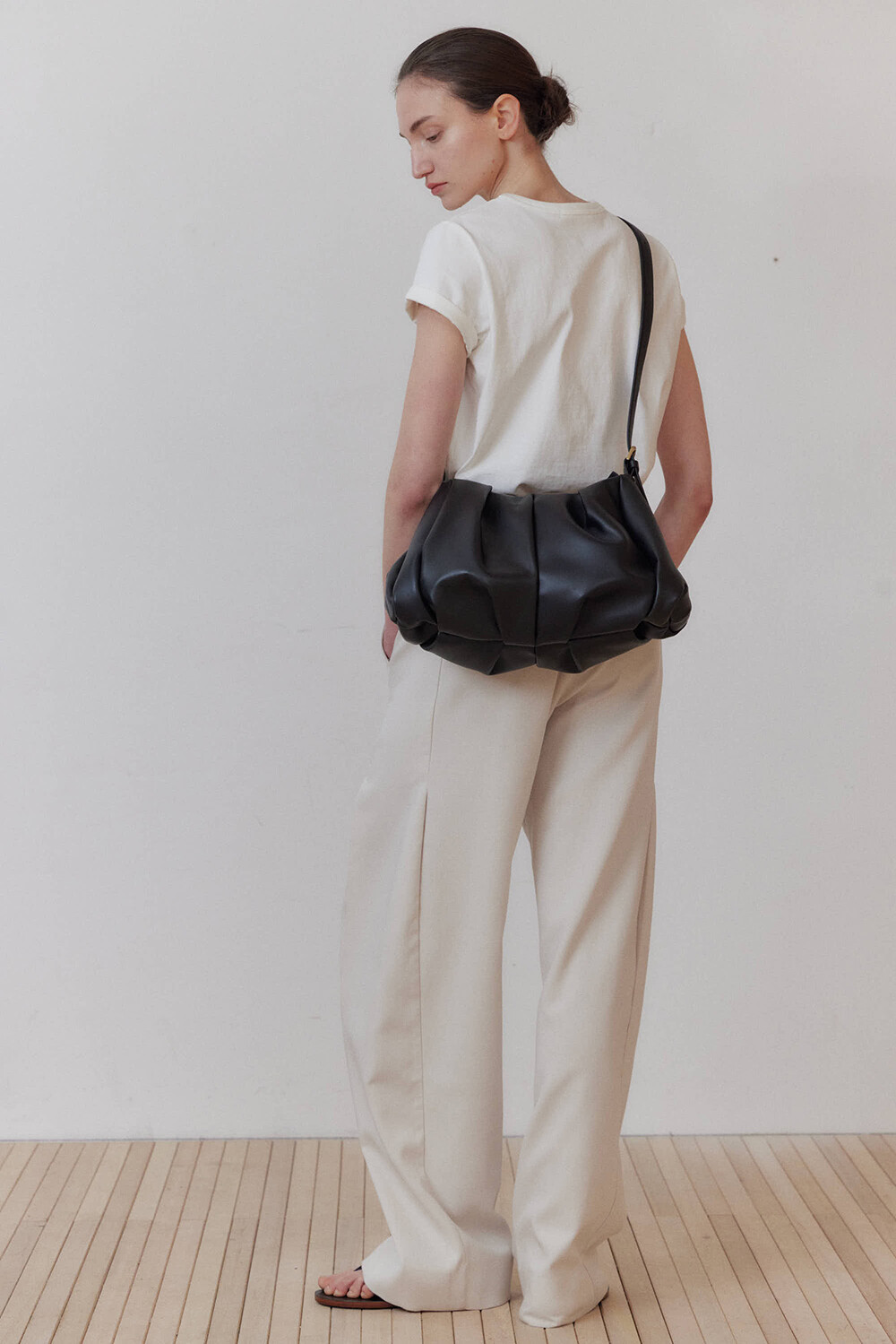 - 부드러운 양가죽을 드레이핑하여 흐르는 결의 실루엣을 극대화한 데일리백입니다.