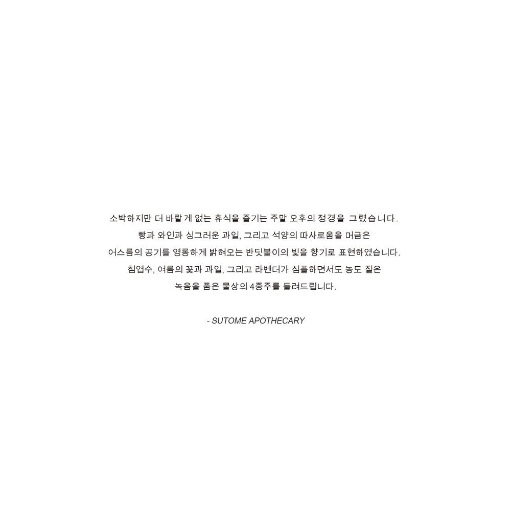 고요한 소나무와 산뜻한 광귤 향의 조화로 자연 그대로의 싱그러움을 느낄 수 있으며, 뒤따라오는 은은한 프렌치 라벤더의 향이 나른한 무드를 그립니다.